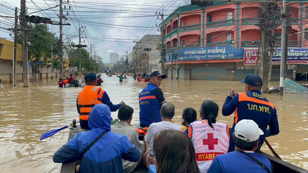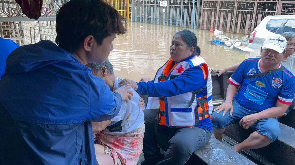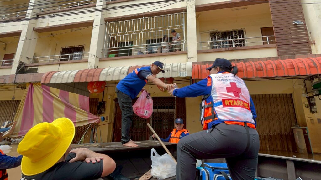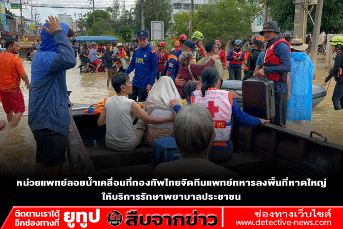 โดยได้นำ ทีมหมอทหาร ลงเรือเข้าตรวจรักษาอาการเจ็บป่วยทั่วไป และแจกจ่ายยา–เวชภัณฑ์ให้กับประชาชนที่ยังติดค้างในพื้นที่น้ำท่วมสูง ไม่สามารถเดินทางออกมารับบริการทางการแพทย์ได้