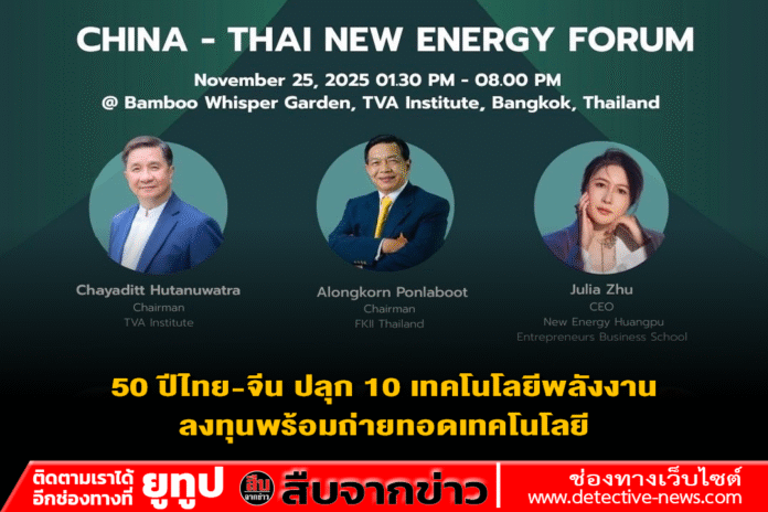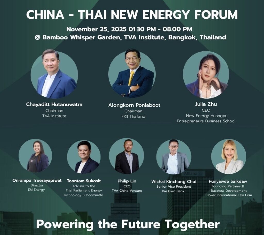นายอลงกรณ์ พลบุตร ประธานสถาบัน FKII Thailand และผู้ก่อตั้งมูลนิธิสถาบันพลังงานทางเลือกแห่งประเทศไทย กล่าวปาฐกถาพิเศษในฟอรั่ม “พลังงานใหม่ จีน-ไทย“ (China-Thai New Energy Forum) ณ TVA Hall สวนเสียงไผ่ โดย TVA China Venture ในเครือ TVA Corporation (สถาบันทิวา) ผลักดันบทบาทของไทยในฐานะศูนย์กลางการลงทุนด้านพลังงานใหม่ของอาเซียน ผ่านเวทีการหารือเชิงลึกระหว่างภาคธุรกิจไทยและจีน ร่วมกับ New Energy Huangpu (ประเทศจีน) ที่มี Julia Zhu Lina เป็นประธาน บรรลุข้อตกลงความร่วมมือระหว่างไทยและจีน ในการเชื่อมโยงธุรกิจพลังงานแห่งอนาคต