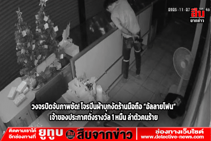 วงจรปิดเผยนาทีโจรแสบปีนฝ้าบุกงัดร้านโทรศัพท์มือถือ “อัลลายโฟน” กลางดึก สูบบุหรี่ตีเนียนก่อนรื้อทรัพย์ กวาดเงินสด 4,000 บาทพร้อมโมเดล iPhone 14 หนี เจ้าของร้านสุดช้ำ วอนตำรวจเร่งล่าตัวคนร้าย ตั้งรางวัลนำจับ 10,000 บาทสำหรับผู้แจ้งเบาะแส