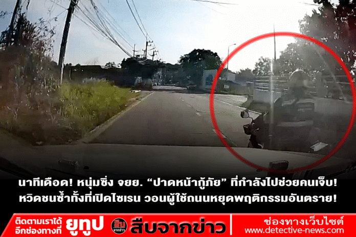 อุทาหรณ์ที่น่าโมโห! เจ้าหน้าที่กู้ภัยสว่างประทีปศรีราชา เผยคลิปวิดีโอจากกล้องหน้ารถ บันทึกภาพเหตุการณ์ขณะรถกู้ภัยที่เปิดสัญญาณไฟและสัญญาณเสียงกำลังเร่งไปช่วยเหลือผู้ประสบอุบัติเหตุ แต่กลับถูกชายขี่รถจักรยานยนต์คันหนึ่ง ปาดหน้าอย่างกะทันหัน จนเกือบเกิดอุบัติเหตุซ้ำซ้อน นายสมบูรณ์ บ้านใหม่ เจ้าหน้าที่กู้ภัย วอนผู้ใช้รถใช้ถนนตระหนักและโปรดให้ทางแก่รถฉุกเฉิน เพื่อไม่ให้การช่วยชีวิตต้องล่าช้า
