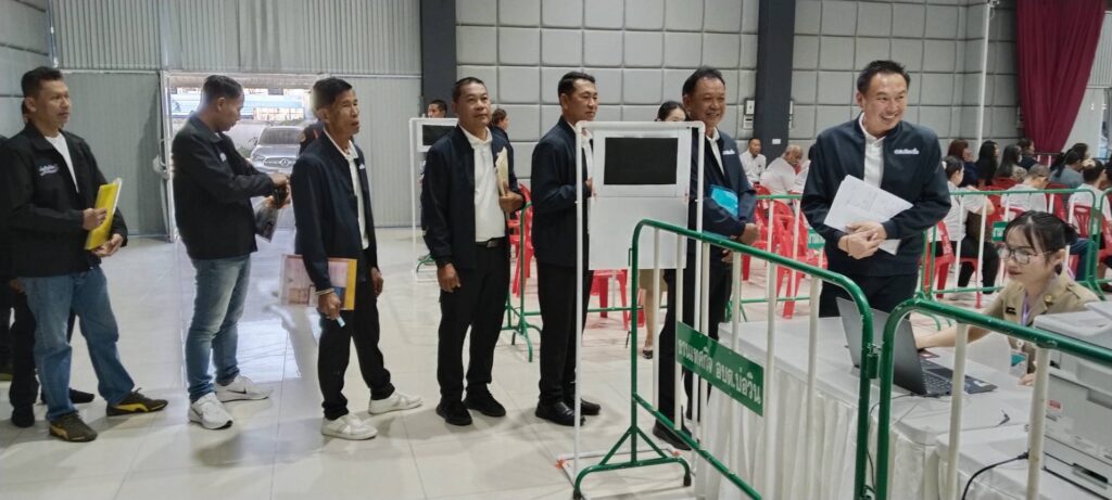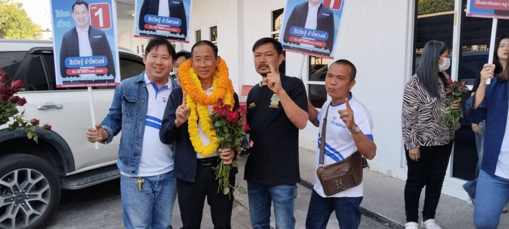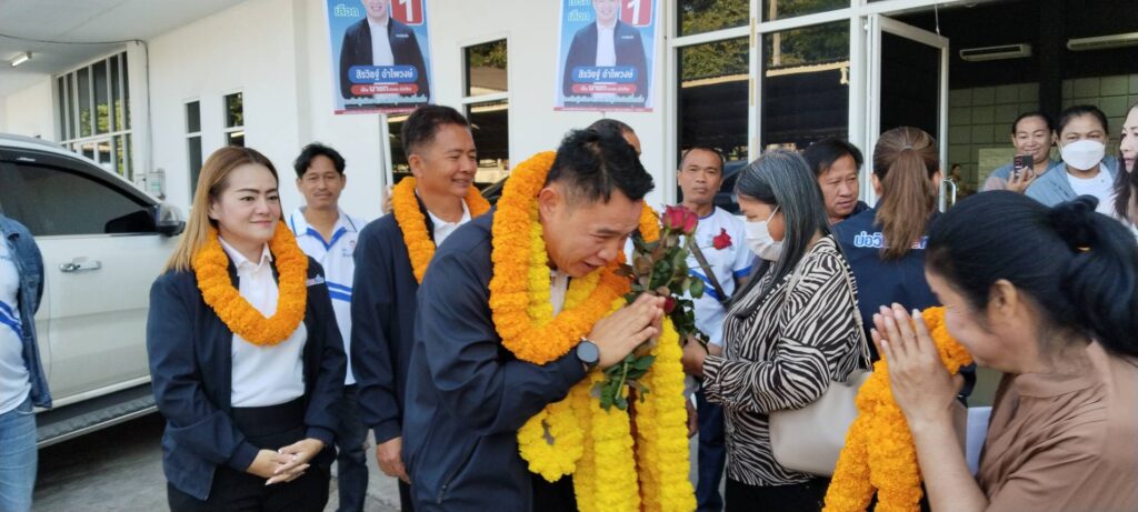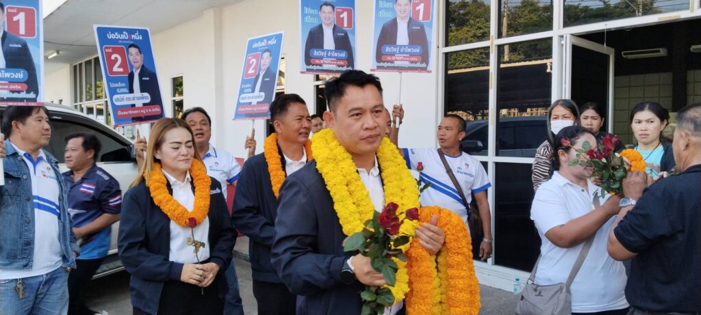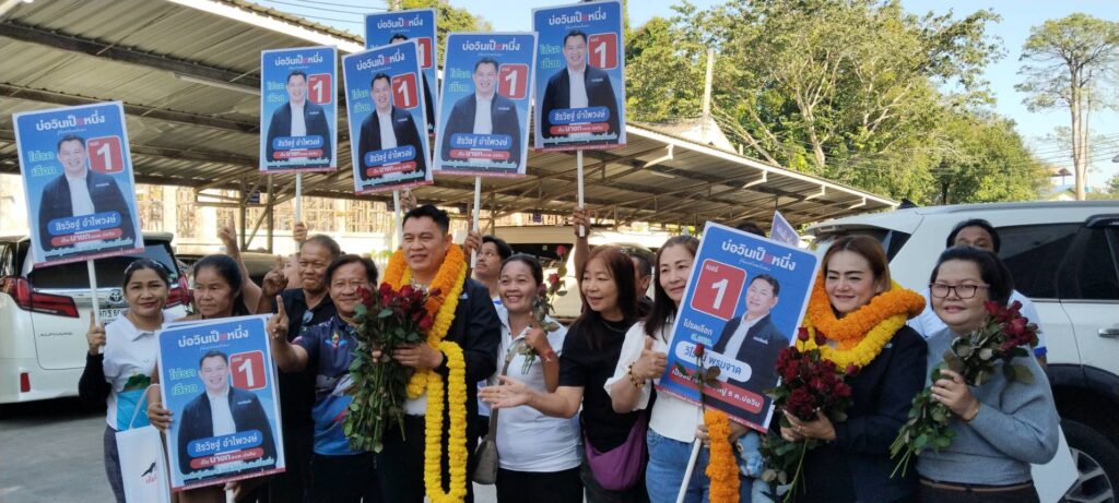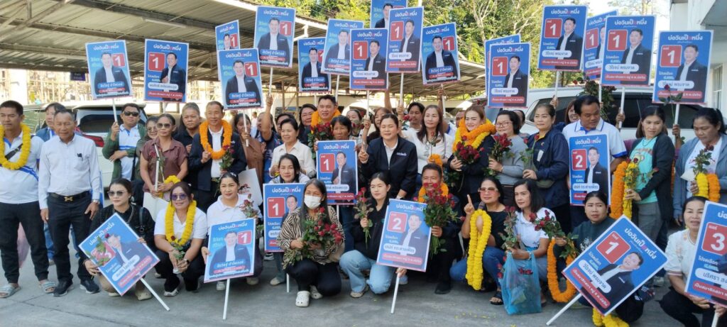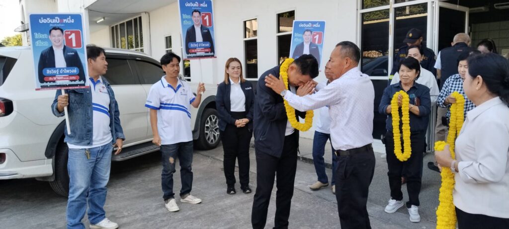 หลังเสร็จสิ้นกระบวนการรับสมัครและจับสลากหมายเลข กลุ่มผู้สนับสนุน “กลุ่มบ่อวินเป็นหนึ่ง” ได้มาร่วมมอบดอกไม้แสดงความยินดีอย่างคึกคัก บริเวณหน้าสถานที่รับสมัคร