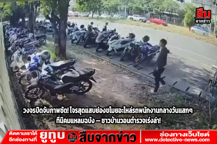 โจรไม่เกรงกลัวกฎหมาย! วงจรปิดจับภาพคนร้ายบุกลานจอดรถในนิคมแหลมฉบัง กลางวันแสก ๆ ย่องขโมย “กล่องไฟรถจักรยานยนต์” ของพนักงานบริษัท ชาวบ้านเผยพื้นที่ถูกโจรย่องลักทรัพย์บ่อยครั้ง วอนตำรวจเพิ่มการลาดตระเวนและเร่งจับกุมตัวผู้ก่อเหตุ