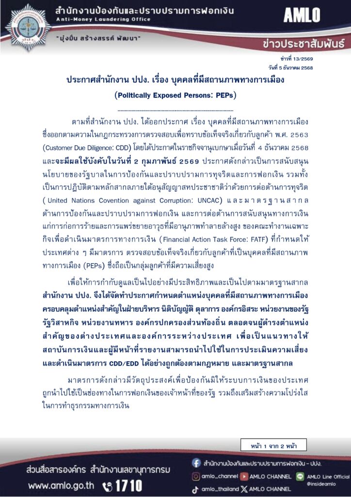 - ประกาศ: เรื่อง บุคคลที่มีสถานภาพทางการเมือง (PEPs)