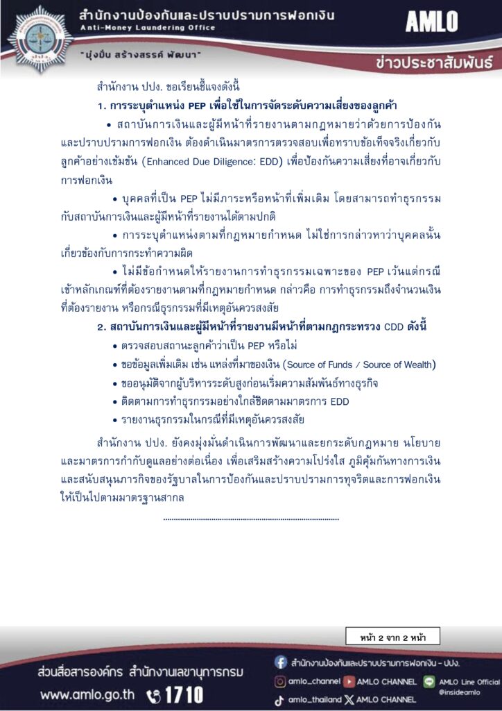 สำนักงาน ปปง. ย้ำชัดเจนเพื่อไม่ให้เกิดความตื่นตระหนก การถูกจัดเป็น PEPs “ไม่ใช่การตราหน้าว่าเป็นผู้กระทำความผิด”