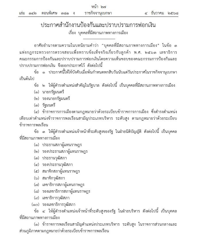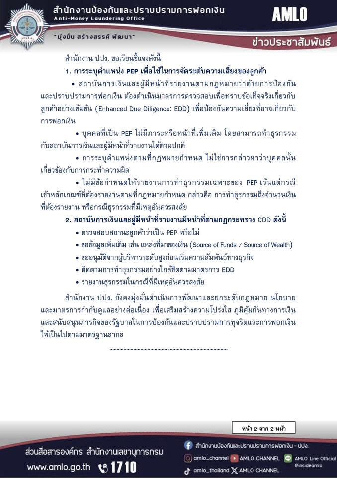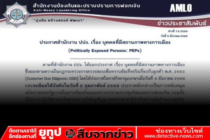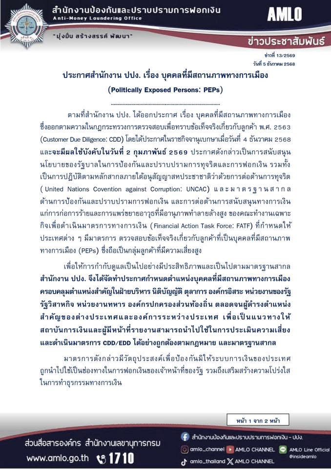 ตามที่สำนักงาน ปปง. ได้ออกประกาศ เรื่อง บุคคลที่มีสถานภาพทางการเมือง ซึ่งออกตามความในกฎกระทรวงการตรวจสอบเพื่อทราบข้อเท็จจริงเกี่ยวกับลูกค้า พ.ศ. 2563 (Customer Due Diligence: CDD) โดยได้ประกาศในราชกิจจานุเบกษาเมื่อวันที่ 4 ธันวาคม 2568 และจะมีผลใช้บังคับในวันที่ 2 กุมภาพันธ์ 2569 ประกาศดังกล่าวเป็นการสนับสนุนนโยบายของรัฐบาลในการป้องกันและปราบปรามการทุจริตและการฟอกเงิน รวมทั้งเป็นการปฏิบัติตามหลักสากลภายใต้อนุสัญญาสหประชาชาติว่าด้วยการต่อต้านการทุจริต (United Nations Covention against Corruption: UNCAC) และมาตรฐานสากลด้านการป้องกันและปราบปรามการฟอกเงิน และการต่อต้านการสนับสนุนทางการเงินแก่การก่อการร้ายและการแพร่ขยายอาวุธที่มีอานุภาพทำลายล้างสูง ของคณะทำงานเฉพาะกิจเพื่อดำเนินมาตรการทางการเงิน (Financial Action Task Force: FATF) ที่กำหนดให้ประเทศต่าง ๆ มีมาตรการ ตรวจสอบข้อเท็จจริงเกี่ยวกับลูกค้าที่เป็นบุคคลที่มีสถานภาพทางการเมือง (PEPs) ซึ่งถือเป็นกลุ่มลูกค้าที่มีความเสี่ยงสูง