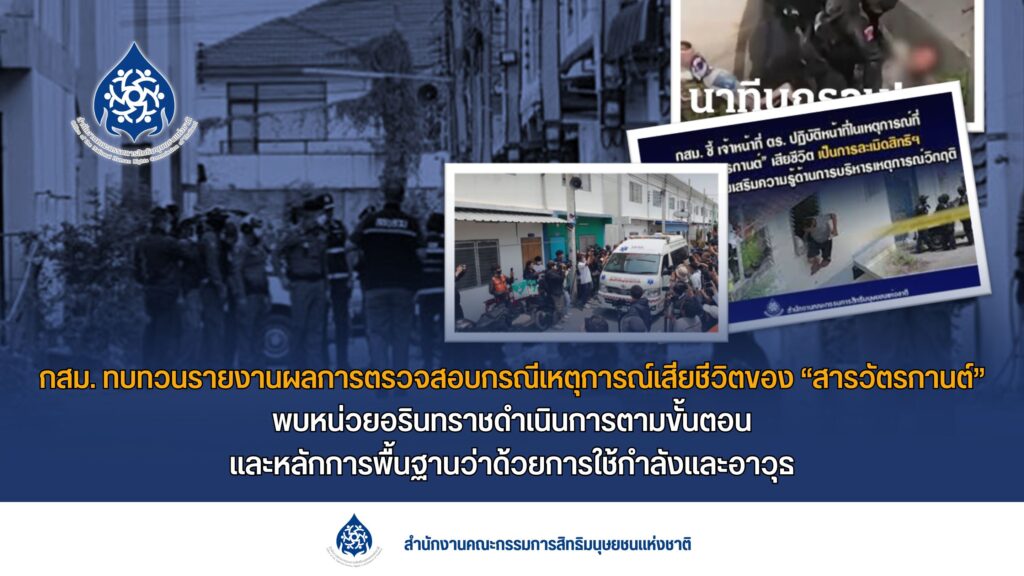 กสม. ทบทวนรายงานผลการตรวจสอบกรณีเสียชีวิตของ “สารวัตรกานต์” หลังตำรวจหน่วยอรินทราช 26 ถูกกล่าวหายิงเกินกว่าเหตุ พบปฏิบัติการเป็นไปตามขั้นตอนและหลักการใช้กำลังอย่างได้สัดส่วน ไม่เข้าข่ายละเมิดสิทธิมนุษยชน พร้อมเสนอให้สำนักงานตำรวจแห่งชาติอบรมเจ้าหน้าที่เรื่องการจัดการวิกฤติ–การเจรจาต่อรอง และตรวจสุขภาพจิตตำรวจอย่างต่อเนื่อง