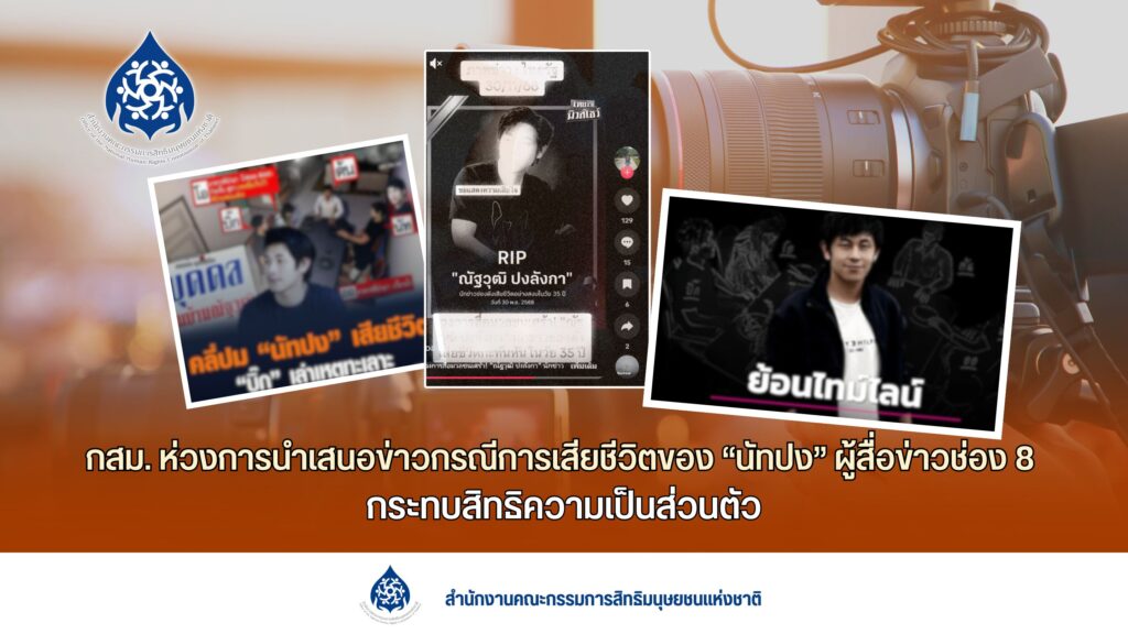 กสม. ห่วงพฤติกรรมสื่อมวลชนและผู้ใช้โซเชียลมีเดีย นำเสนอข่าวกรณีการเสียชีวิตของ “นัทปง” ผู้สื่อข่าวช่อง 8 ล้ำเส้นสิทธิส่วนบุคคล เผยแพร่ข้อมูลส่วนตัว–ความสัมพันธ์ส่วนตัวโดยไม่จำเป็น ย้ำเสรีภาพสื่อควรอยู่บนขอบเขตจริยธรรมและเคารพศักดิ์ศรีความเป็นมนุษย์