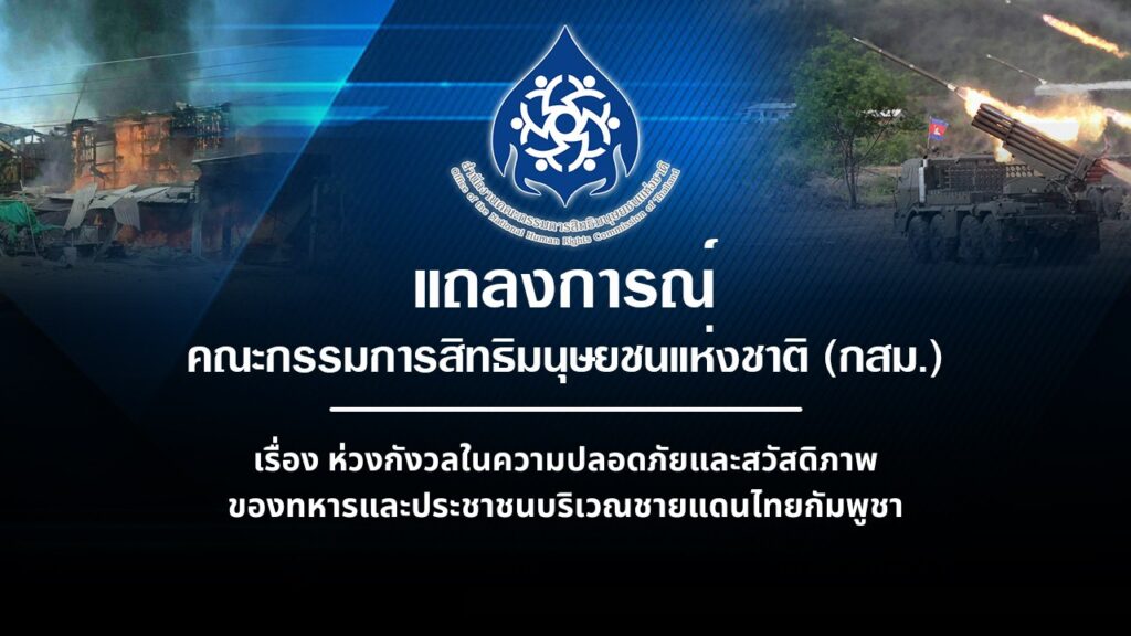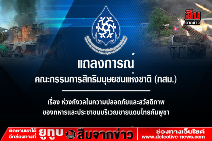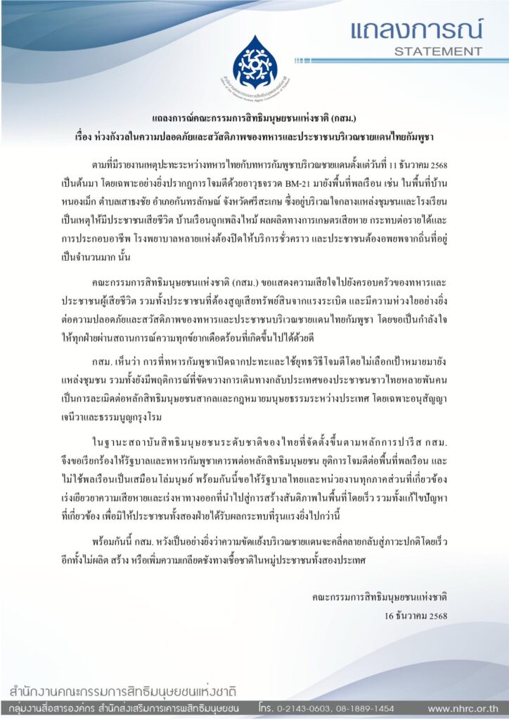 คณะกรรมการสิทธิมนุษยชนแห่งชาติ (กสม.) ออกแถลงการณ์แสดงความห่วงกังวลต่อความปลอดภัยและสวัสดิภาพของทหารและประชาชนบริเวณชายแดนไทย–กัมพูชา หลังเกิดเหตุปะทะตั้งแต่ 11 ธ.ค. 2568 ชี้การโจมตีพื้นที่พลเรือนเข้าข่ายละเมิดสิทธิมนุษยชนและกฎหมายมนุษยธรรมระหว่างประเทศ พร้อมเรียกร้องยุติความรุนแรงและเร่งเยียวยาผู้ได้รับผลกระทบ