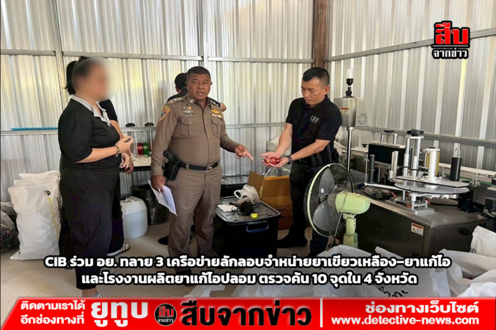 ตำรวจสอบสวนกลาง (CIB) ร่วมกับสำนักงานคณะกรรมการอาหารและยา (อย.) เปิดปฏิบัติการครั้งใหญ่ ทลาย 3 เครือข่ายลักลอบจำหน่าย “ยาเขียวเหลือง–ยาแก้ไอ” และโรงงานผลิตยาแก้ไอปลอมใน 4 จังหวัด ตรวจค้น 10 จุด ยึดของกลางกว่า 1.3 ล้านแคปซูล มูลค่ากว่า 20 ล้านบาท ตัดวงจร “4×100” ที่มอมเมาเยาวชนทั่วประเทศ