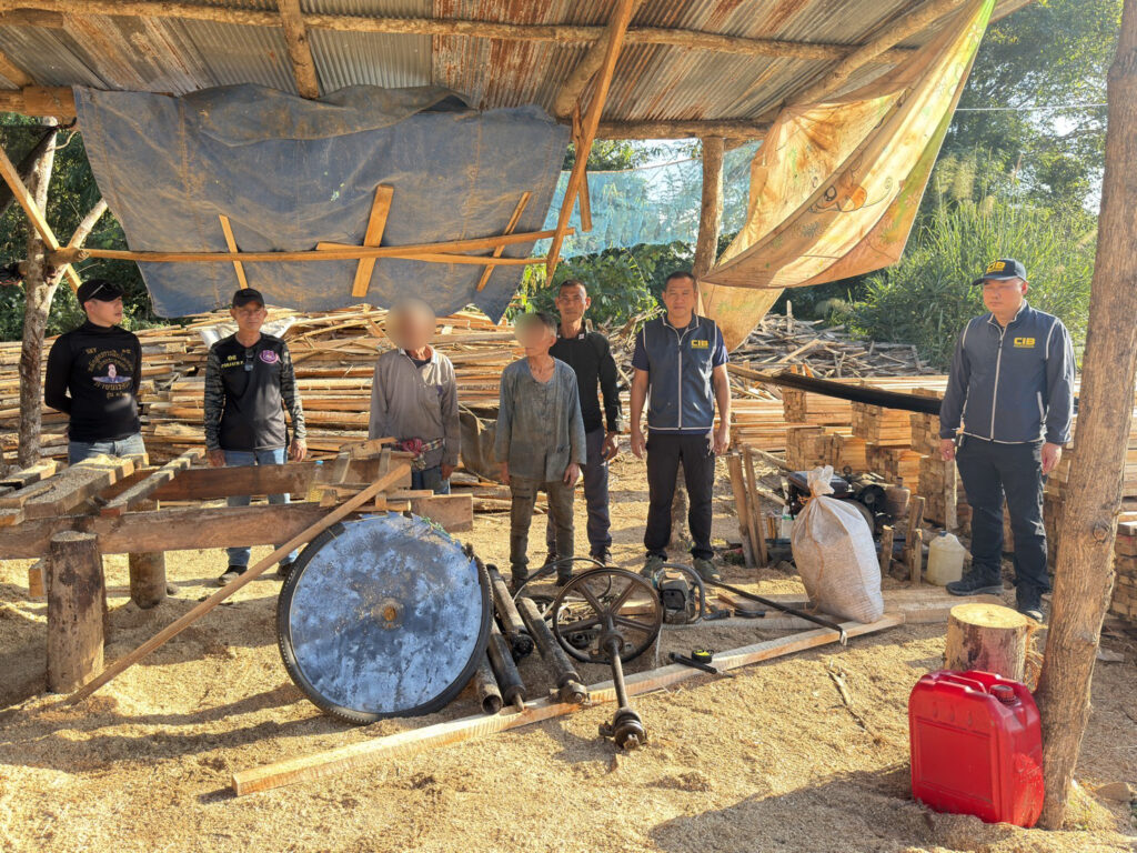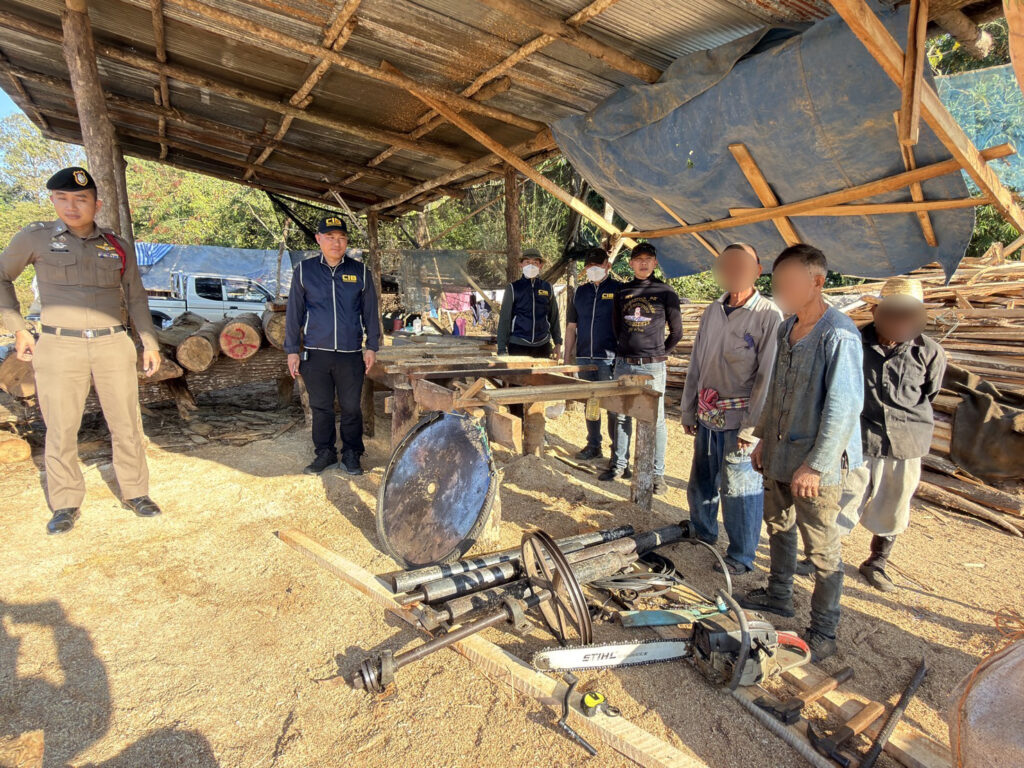 จากการตรวจสอบพบเพิงพักดัดแปลงเป็นโรงงานแปรรูปไม้ มีเครื่องจักรทำงานส่งเสียงดังและมีป้ายประกาศรับซื้อไม้ติดตั้งอย่างเปิดเผย เจ้าหน้าที่จึงแสดงตัวเข้าจับกุมผู้ต้องหา 3 ราย คือ 1.นายสมบูรณ์ (สงวนนามสกุล) อายุ 64 ปี 2.นายอำนวย (สงวนนามสกุล) อายุ 64 ปี 3.นายคำ (สงวนนามสกุล) อายุ 64 ปี
