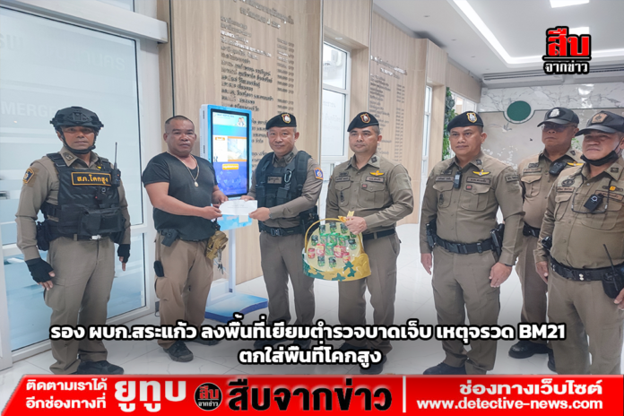 รองผู้บังคับการตำรวจภูธรจังหวัดสระแก้ว เร่งลงพื้นที่ให้กำลังใจ ด.ต.ขจรเกียรติ กันหากุลวัฒน์ ตำรวจ สภ.โคกสูง หลังได้รับบาดเจ็บจากแรงระเบิดของจรวด BM21 ที่ตกในพื้นที่ชายแดนไทย–กัมพูชา ขณะปฏิบัติหน้าที่ดูแลความปลอดภัยประชาชน