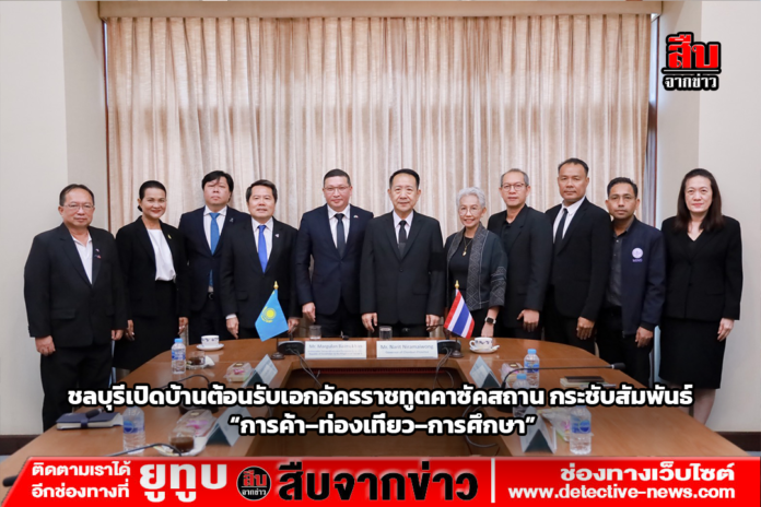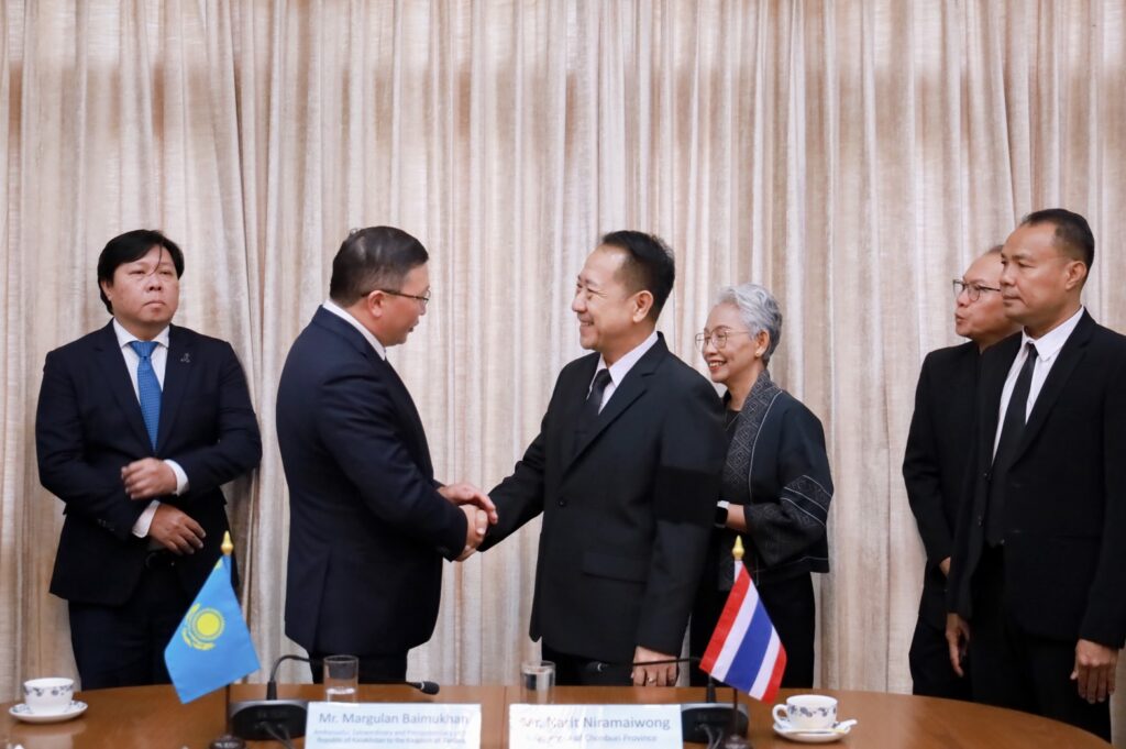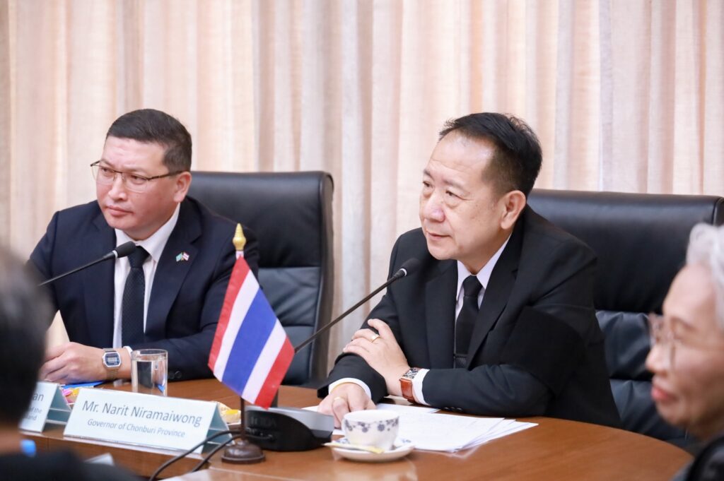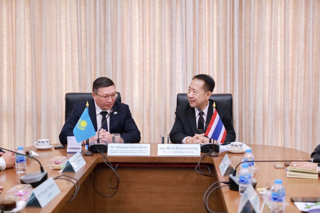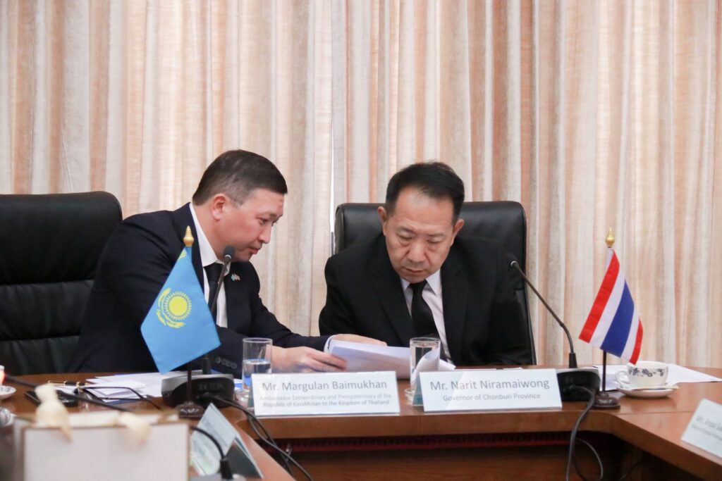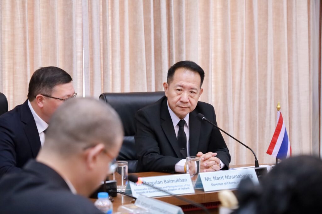 นายนริศ นิรามัยวงศ์ ผู้ว่าราชการจังหวัดชลบุรี ให้การต้อนรับ นายมาร์กูลัน ไบมูคัน เอกอัครราชทูตวิสามัญผู้มีอำนาจเต็มแห่งสาธารณรัฐคาซัคสถาน ประจำราชอาณาจักรไทย ในโอกาสเดินทางเข้าพบเพื่อหารือแนวทาง กระชับความสัมพันธ์และขยายความร่วมมือระหว่างไทย–คาซัคสถาน