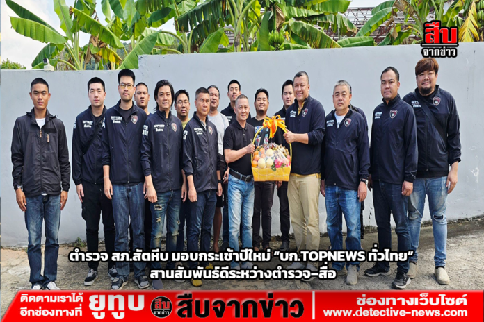 เมื่อวันที่ 23 ธันวาคม 2568 ที่สำนักงานสำนักข่าว TOPNEWS ทั่วไทย พ.ต.ท.เกรียงไกร มีแสง รองผู้กำกับการสืบสวน สถานีตำรวจภูธรสัตหีบ พร้อมด้วย พ.ต.ท.อภิชาติ นามจันโท สารวัตรสืบสวน และเจ้าหน้าที่ตำรวจชุดสืบสวน สภ.สัตหีบ เข้ามอบกระเช้าสวัสดีปีใหม่แก่ นายศิริพงษ์ กลิ่นทวี บรรณาธิการบริหาร สำนักข่าว TOPNEWS ทั่วไทย
