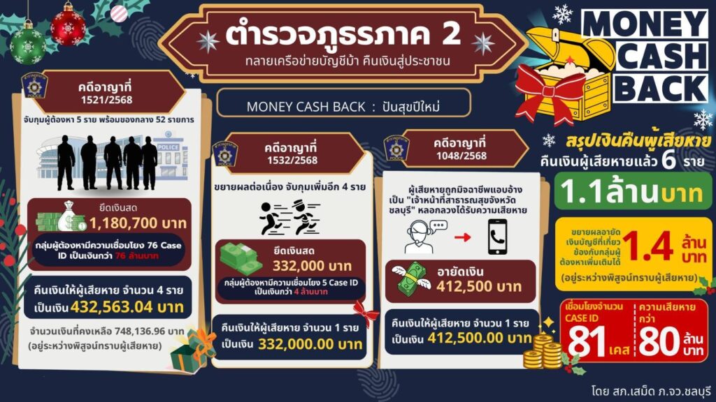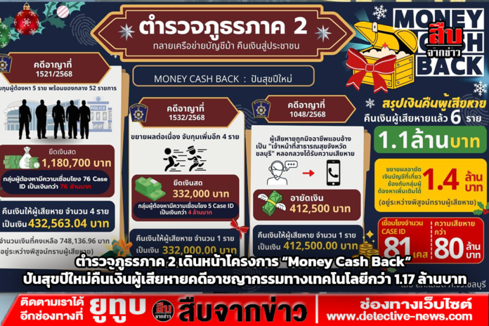 วันที่ 25 ธันวาคม 2568 เวลา 10.00 น. พล.ต.ต.เอกภพ อินทวิวัฒน์ รองผู้บัญชาการตำรวจภูธรภาค 2 และโฆษกตำรวจภูธรภาค 2 เปิดเผยผลการดำเนินงานตามโครงการ “Money Cash Back : ปันสุขปีใหม่ คืนเงินให้ผู้เสียหายคดีอาชญากรรมทางเทคโนโลยี” ซึ่งเป็นนโยบายสำคัญของ พล.ต.ท.ฉัตรชัย สุรเชษฐพงษ์ ผู้บัญชาการตำรวจภูธรภาค 2 ที่มุ่งเน้นการเร่งรัดติดตามทรัพย์สินและคืนความเป็นธรรมให้แก่ผู้เสียหายอย่างเป็นรูปธรรม