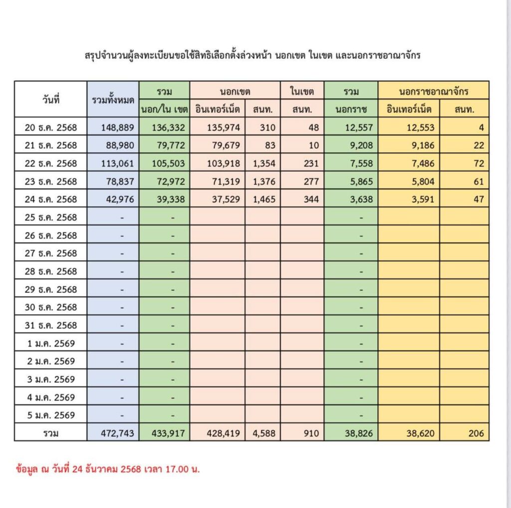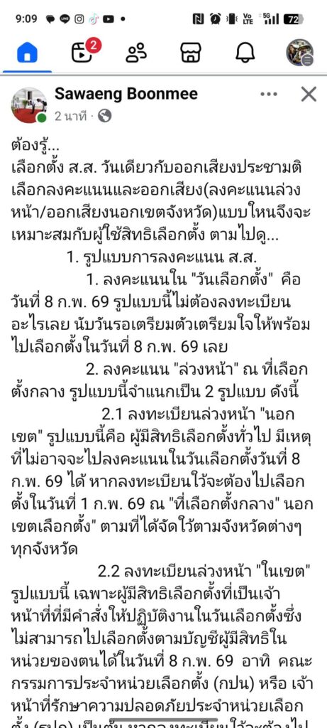 กกต. วันนี้ (25 ธ.ค.) นายแสวง บุญมี เลขาธิการ กกต.โพสต์ข้อความถึงสิ่งต้องรู้ในการเลือกตั้ง สส.วันเดียวกับออกเสียงประชามติ การเลือกลงคะแนนและออกเสียงลงคะแนนล่วงหน้า การเลือกออกเสียงนอกเขตจังหวัด แบบใหนจึงจะเหมาะสมกับผู้ใช้สิทธิเลือกตั้ง ว่ารูปแบบการลงคะแนนเลือกตั้ง สส. ลงคะแนนในวันเลือกตั้งคือวันที่ 8 ก.พ. 69 รูปแบบนี้ไม่ต้องลงทะเบียนอะไรเลย นับวันรอเตรียมตัวเตรียมใจให้พร้อมไปเลือกตั้งในวันที่ 8 ก.พ. 69 เลย
