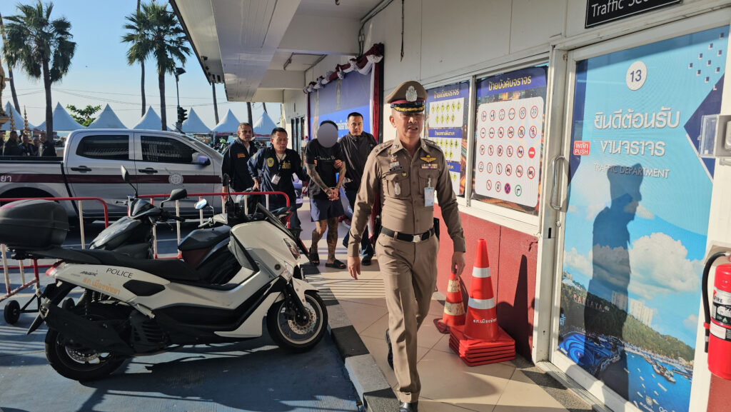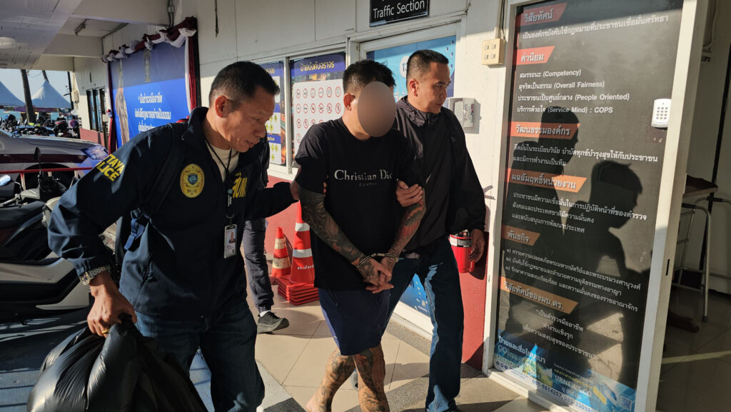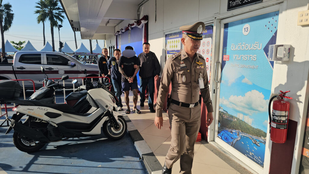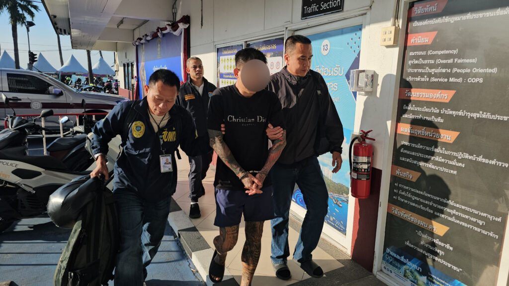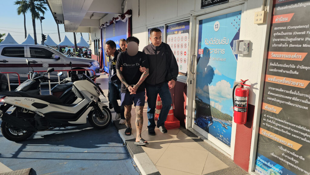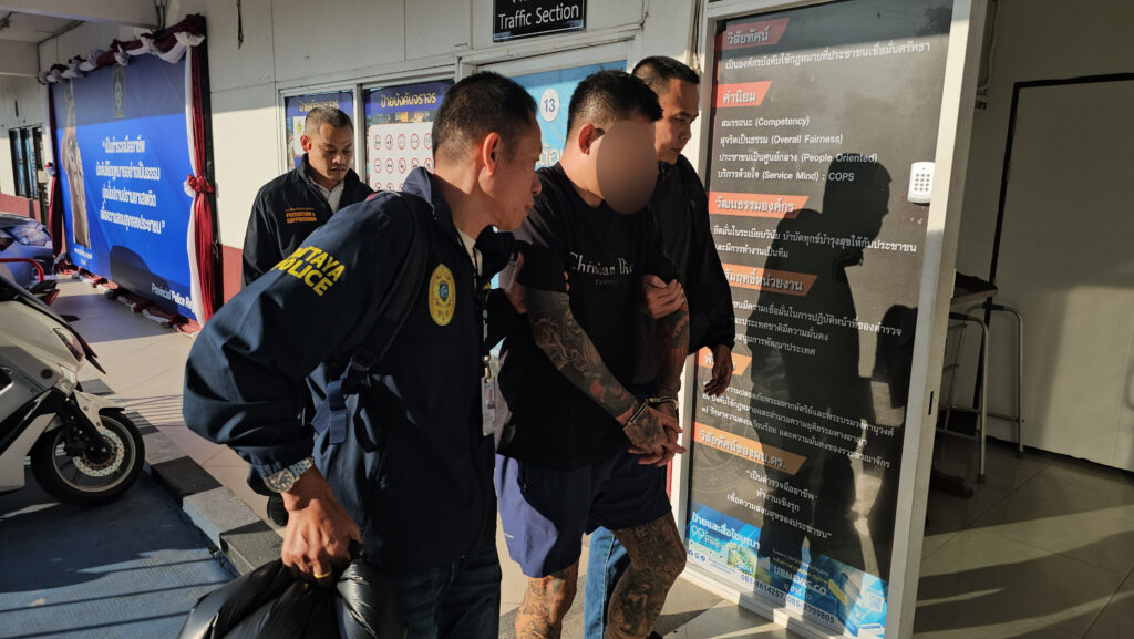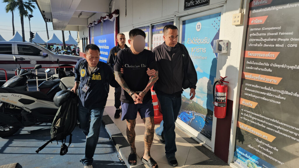 ต่อมาเวลา 16.30 น. วันที่ 29 ธันวาคม 2568 พ.ต.อ.เอนก สระทองอยู่ ผกก.สภ.เมืองพัทยา พร้อมด้วย พ.ต.ท.อรุษ สภานนท์ รอง ผกก.สส. สภ.เมืองพัทยา นำกำลังชุดสืบสวนร่วมกับตำรวจตรวจคนเข้าเมือง จ.ชลบุรี และตำรวจท่องเที่ยวเมืองพัทยา ควบคุมตัวผู้ก่อเหตุ ทราบชื่อ นายเฉา เฉิน (Chao Chen) อายุ 36 ปี สัญชาติจีน พร้อมของกลางเป็นเสื้อผ้าเครื่องแต่งกาย (เสื้อฮู้ดแขนยาว-กางเกงขายาวสีดำ) ที่สวมใส่ในวันเกิดเหตุ โดยสามารถจับกุมได้ภายในค่ายมวยริมถนนเลียบทางรถไฟ