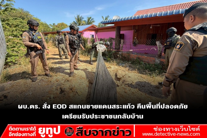 โดย พล.ต.อ.กิตติ์รัฐ พันธุ์เพ็ชร์ ผบ.ตร. สั่งการให้ พล.ต.ท.ฉัตรชัย สุรเชษฐพงษ์ ผบช.ภ.2 ส่งหน่วยเก็บกู้และตรวจพิสูจน์วัตถุระเบิด (EOD) ตำรวจภูธรภาค 2 ลงพื้นที่จังหวัดสระแก้ว สแกนพื้นที่เสี่ยง เก็บกู้วัตถุระเบิดที่อาจหลงเหลือ เพื่อคืนพื้นที่ให้ประชาชนอย่างปลอดภัย