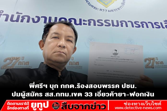 เมื่อวันที่ 30 ธ.ค.68 ที่อาคารบี ศูนย์ราชการฯ แจ้งวัฒนะ นายศรีสุวรรณ จรรยา ผู้นำองค์กรรักชาติ รักแผ่นดิน ได้ยื่นคำร้องแจ้งเบาะแสแก่คณะกรรมการการเลือกตั้ง(กกต.)และนายทะเบียนพรรคการเมือง เพื่อขอให้ไต่สวนสอบสวนพรรคประชาชนกรณีที่ปรากฎเป็นการทั่วไปต่อการที่นายบุญฤทธิ์ เรารุ่งโรจน์ (แบงค์)อดีตผู้สมัคร สส.กทม. เขต 33 (บางพลัด–บางกอกน้อย) ในนามพรรคประชาชนถูกตำรวจปราบปรามยาเสพติด (บช.ปส.)เข้าจับกุมในปฏิบัติการ Black Mirror TKP