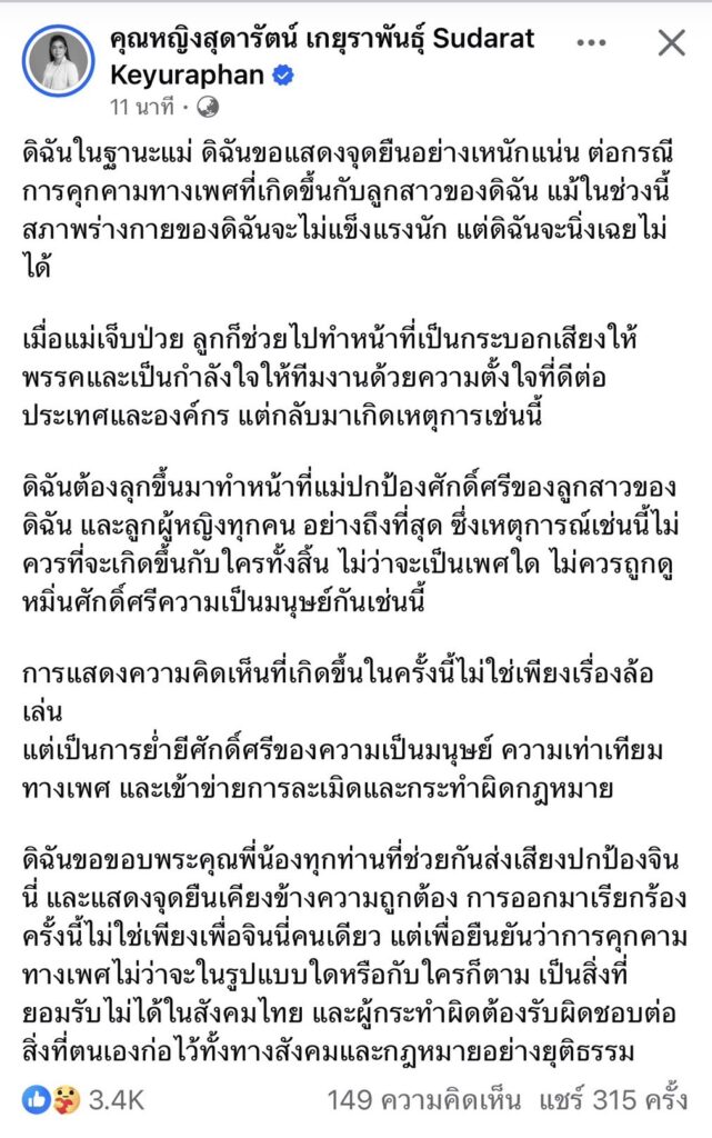 เดินหน้าฟ้อง ประเดิมกฎหมายคุกคามทางเพศฉบับใหม่ นายภัชริ นิจสิริภัช กรรมการบริหารพรรคไทยสร้างไทย ออกมายืนยันว่า ผู้เสียหาย (จินนี่ ยศสุดา) ตัดสินใจดำเนินคดีอย่างถึงที่สุด โดยมีประเด็นสำคัญ
