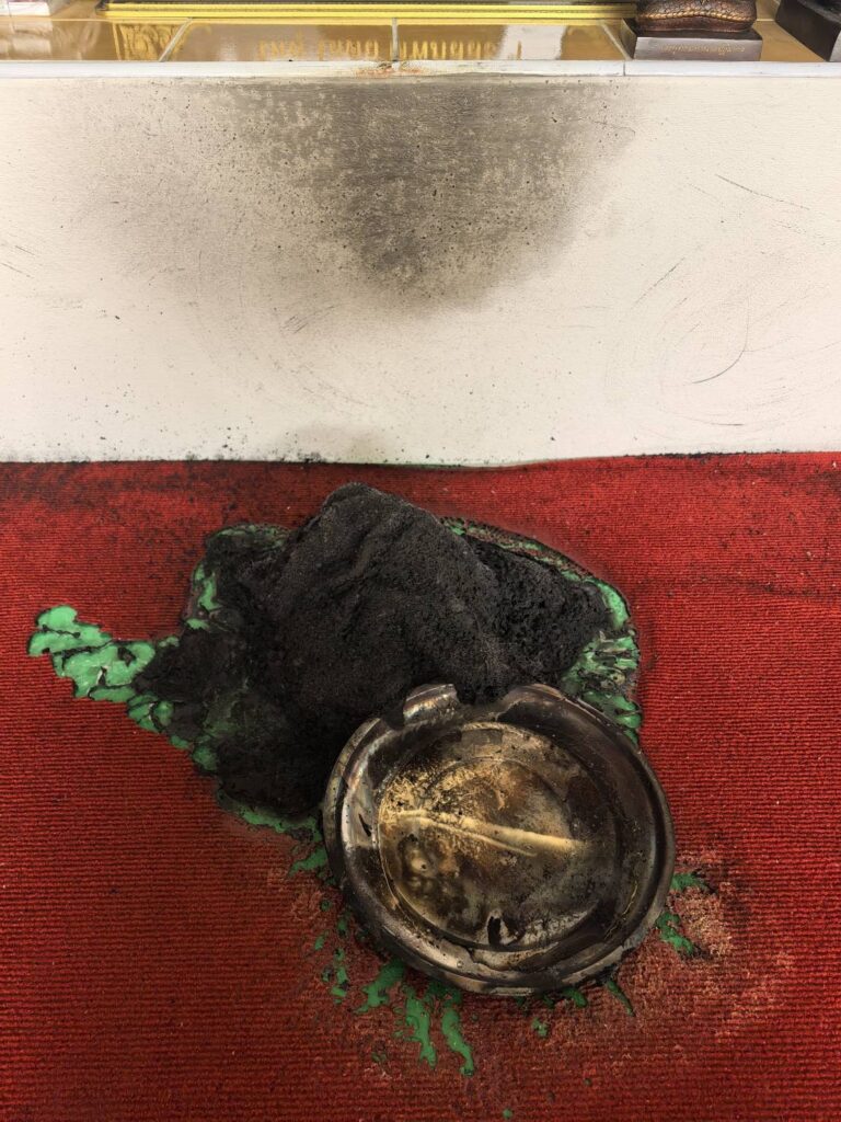 จากหลักฐานในกล้องวงจรปิด พบว่าเพลิงได้ลุกไหม้อยู่นานกว่า 10 นาที แต่ที่น่าแปลกใจคือ เปลวไฟกลับจำกัดวงอยู่เพียงรอบๆ ถาดและพานรองสแตนเลสเท่านั้น ไม่ลุกลามไปทั่วพื้นพรมหรือจุดอื่นๆ ในสำนักงาน ทั้งที่มีเชื้อไฟอย่างดี