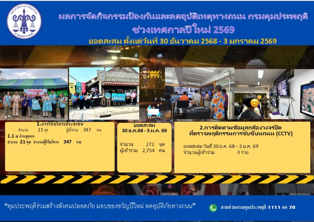 อธิบดีกรมคุมประพฤติ ย้ำมาตรการช่วงควบคุมเข้มข้น ยังคงเดินหน้าสร้างความปลอดภัยให้กับประชาชน โดยการผสานกำลังให้สำนักงานคุมประพฤติทั่วประเทศบูรณาการจัดกิจกรรมร่วมกับหน่วยงานที่เกี่ยวข้องและอาสาสมัครคุมประพฤติในพื้นที่ นำผู้ถูกคุมความประพฤติทำงานบริการสังคม ณ หน่วยบริการประชาชน ทั้งในจุดตรวจหลักและด่านชุมชน รวมถึงการทำความสะอาดและปรับภูมิทัศน์บริเวณจุดเสี่ยง จำนวน 272 จุด โดยมีผู้เข้าร่วมกิจกรรมทั้งสิ้น จำนวน 2,754 ราย เพื่อเป็นการรณรงค์ป้องกันและลดอุบัติเหตุทางถนน เพื่อสร้างความปลอดภัยให้สังคมช่วงเทศกาลปีใหม่ 2569