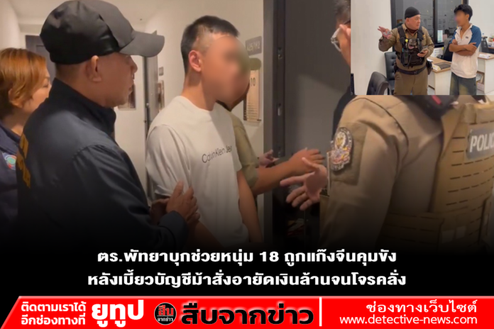 พัทยา – นาทีระทึก! ตำรวจพัทยาบุกช่วยเยาวชนวัย 18 ปี ถูกแก๊งจีนเทาฉุดขึ้นคอนโดฯ กักขังหน่วงเหนี่ยวหวังทำร้าย หลังเหยื่อไหวตัวทันสั่งอายัดบัญชีม้าทำพิษชวดเงินก้อนโต โชคดีดิ้นหลุดขอความช่วยเหลือพนักงานทันควัน รวบผู้ต้องหาชาวจีนพร้อมหญิงไทยคาห้องพัก