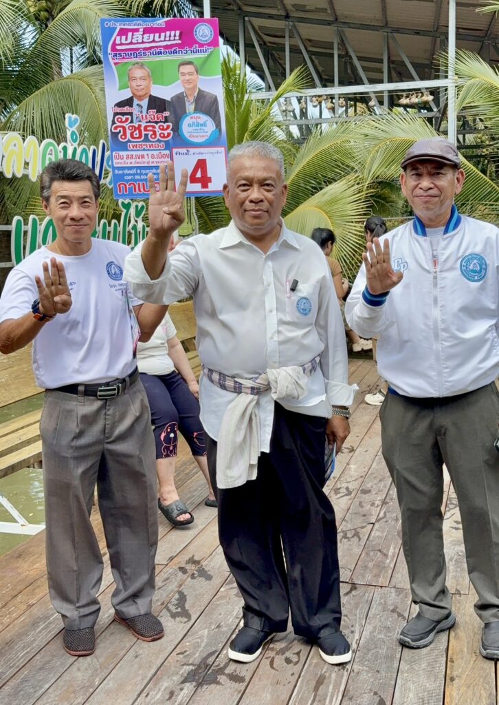 ต่อมานายวัชระ เพชรทอง ผู้สมัครสส.เบอร์ 4 ได้ไปขอคะแนนกับกำนันสาว นางสาวจรัญญา ศรีรักษ์ กำนันตำบลบางใบไม้ กล่าวว่า”ขออวยพรให้สู้เงินให้ได้“