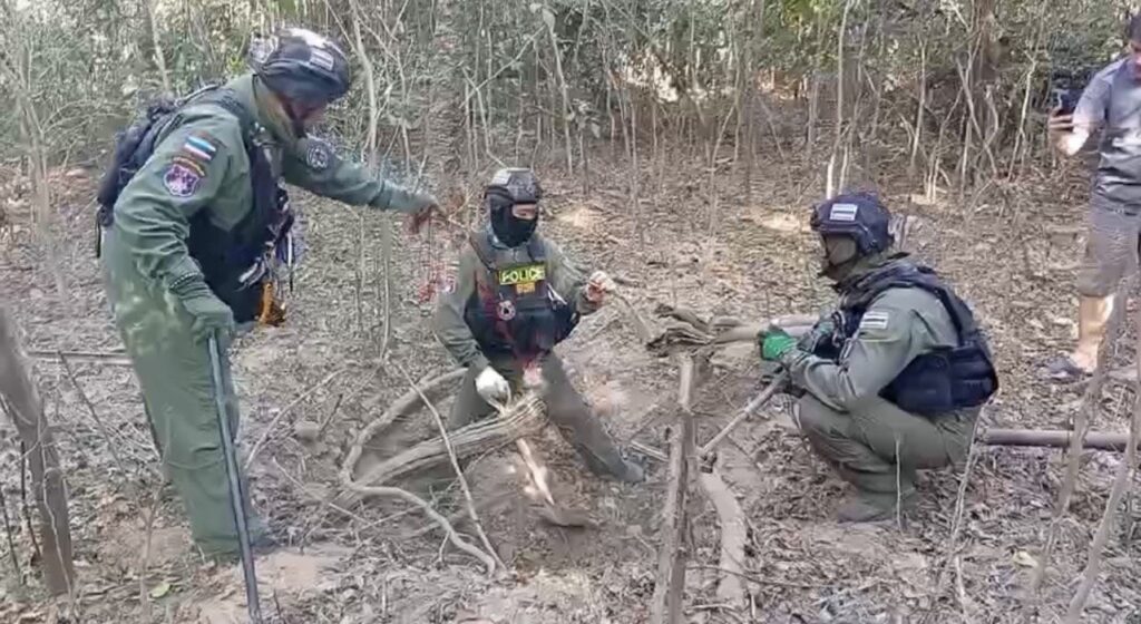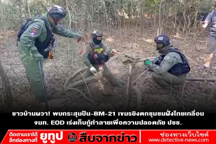 เมื่อวันที่ 5 ม.ค. 69 เจ้าหน้าที่ชุด EOD กองกำกับการตำรวจตระเวนชายแดน ที่ 22 (กก.ตชด.22) ร่วมกับ ชุด EOD ภ.จว.ศรีสะเกษ โดยการนำ ร.ต.อ.ธีรภัทร นามมั่น หัวหน้าชุด EOD กก.ตชด.22 ได้ร่วมกันตรวจสอบร่องรอยหลุมลูกจรวด BM-21 และลูกปืนใหญ่ ลูกปืน ปรส.82 ที่ฝ่ายทหารกัมพูชา ยิงมาตกในหมู่บ้านชายแดน ต.เสาธงชัย และบ้านโศกขามป้อม ต.ภูผาหมอก อ.กันทรลักษ์ จ.ศรีสะเกษ โดย เจ้าหน้าที่ได้เข้าทำการสำรวจตรวจสอบเก็บไปทำลาย จำนวน 10 ลูก ส่วนมากเป็นลูกกระสุนจรวดหลายลำกล้อง BM-21 และกระสุนปืน ปรส.82 ลูกกระสุนปืนใหญ่ ขนาด 100 มม.ตกในพื้นที่ชุมชน จึงเก็บกู้เพื่อนำไปทำลายในพื้นที่ห่างจากจากชุมชน