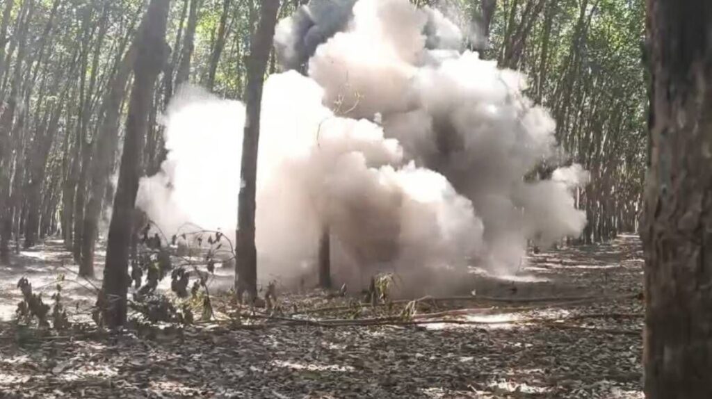 ทั้งนี้ เจ้าหน้าที่ชุด EOD กก.ตชด.22 กล่าวว่า วันนี้ได้เข้าตรวจสอบพื้นที่กระสุนตกมากกว่า 10 จุดในพื้นที่ชุมชน ได้ทำการเก็บทำลาย ประกอบด้วย กระสุนปืน ปรส.82 เป็นกระสุนปืนนำวิถีชนิดสามารถทำลายรถถังทำลายบังเกอร์ได้ ช่วงนี้ประชาชนเริ่มกลับเข้าพื้นที่แล้ว เพื่อใช้ชีวิตอย่างปกติแล้ว จึงขอฝากแจ้งเตือนที่พบวัตถุต้องสงสัยว่าจะเป็นลูกจรวดหรือการสุนปืน ให้แจ้งเจ้าหน้าที่หรือกำนัน-ผู้ใหญ่บ้าน ผู้นำท้องถิ่น ไปตรวจสอบแล้วแจ้งไปยังชุด EOD เข้ามาเก็บกู้ทำลาย เพื่อความปลอดภัยของประชาชน.