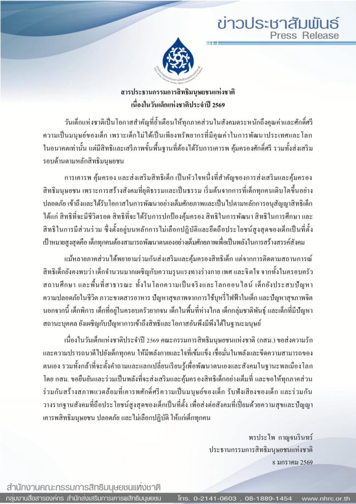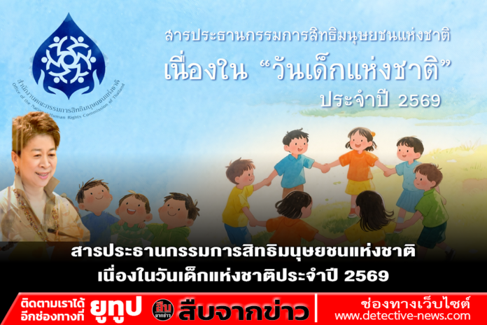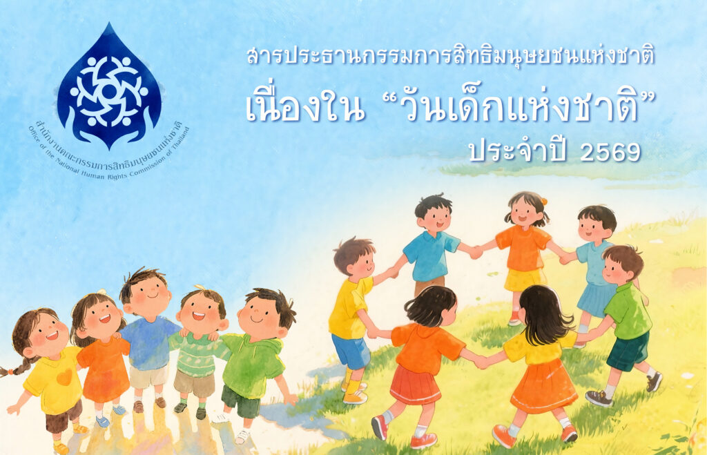 เนื่องในวันเด็กแห่งชาติประจำปี 2569 คณะกรรมการสิทธิมนุษยชนแห่งชาติ (กสม.) ขอส่งความรักและความปรารถนาดีไปยังเด็กทุกคน ให้มีพลังกายและใจที่เข้มแข็ง เชื่อมั่นในพลังและขีดความสามารถของตนเอง รวมทั้งกล้าที่จะตั้งคำถามและแลกเปลี่ยนเรียนรู้เพื่อพัฒนาตนเองและสังคมในฐานะพลเมืองโลก โดย กสม. ขอยืนยันและร่วมเป็นพลังที่จะส่งเสริมและคุ้มครองสิทธิเด็กอย่างเต็มที่ และขอให้ทุกภาคส่วนร่วมกันสร้างสภาพแวดล้อมที่เคารพศักดิ์ศรีความเป็นมนุษย์ของเด็ก รับฟังเสียงของเด็ก และร่วมกันวางรากฐานสังคมที่ถือประโยชน์สูงสุดของเด็กเป็นที่ตั้ง เพื่อส่งต่อสังคมที่เปี่ยมด้วยความสุขและปัญญา เคารพสิทธิมนุษยชน ปลอดภัย และไม่เลือกปฏิบัติ ให้แก่เด็กทุกคน