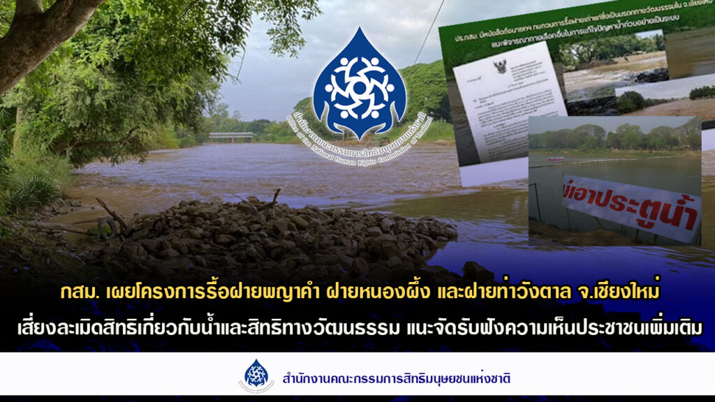 1.กสม. เผยผลการตรวจสอบโครงการรื้อฝายพญาคำ ฝายหนองผึ้ง และฝายท่าวังตาล จ.เชียงใหม่ ชี้เสี่ยงละเมิดสิทธิเกี่ยวกับน้ำและสิทธิทางวัฒนธรรม แนะจัดรับฟังความเห็นประชาชนเพิ่มเติม