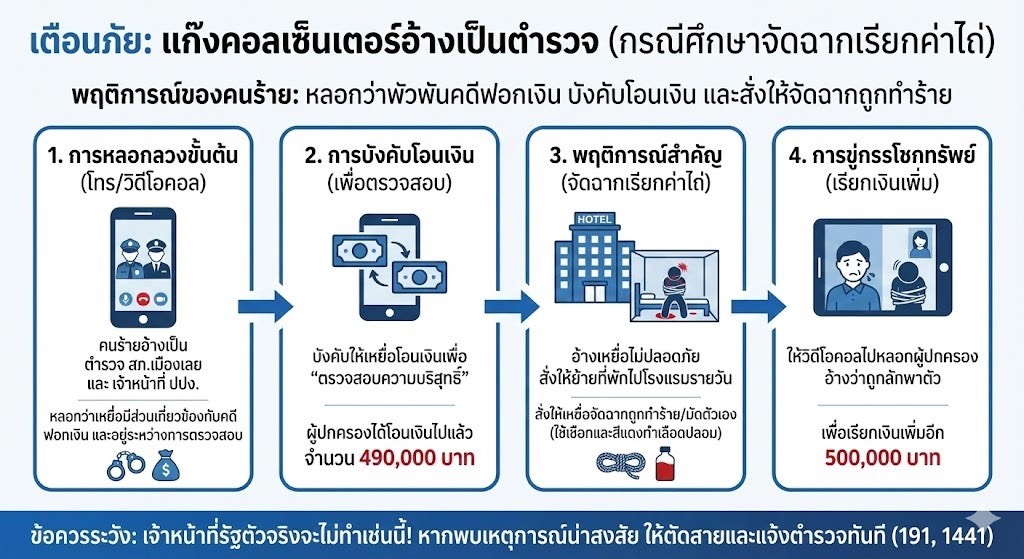 ภายหลังรับเรื่อง เจ้าหน้าที่ตำรวจในพื้นที่ได้ลงพื้นที่ตรวจสอบ จนทราบพิกัดอพาร์ทเมนท์ที่นักศึกษาชายคนดังกล่าวอยู่ จึงประสานนิติฯเข้าเคาะห้อง ก่อนที่ผู้เสียหายจะเปิดประตูออกมา อยู่ในอาการตกใจกลัว เจ้าหน้าที่ตำรวจจึงรีบแสดงบัตรยืนยันตัวตนและปลอบประโลมให้อยู่ในอาการสงบ จากการสอบถามทราบว่าคนร้ายได้โทรศัพท์และวิดีโอคอล อ้างตัวเป็นเจ้าหน้าที่ตำรวจ สภ.เมืองเลย และเจ้าหน้าที่ ปปง. หลอกเหยื่อว่ามีส่วนเกี่ยวข้องกับคดีฟอกเงิน ก่อนบังคับให้โอนเงินไปเพื่อตรวจสอบความบริสุทธิ์ ซึ่งรอบแรกผู้ปกครองโอนเงินไปให้แล้วจำนวน 490,000 บาท