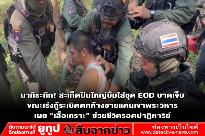 เลือดอาบชายแดน! เจ้าหน้าที่ชุด EOD กองกำกับการตำรวจตระเวนชายแดนที่ 22 พลาดท่าถูกสะเก็ดปืนใหญ่ระเบิดใส่ไหล่ซ้ายขณะปฏิบัติหน้าที่เก็บกู้กระสุนตกค้าง 7 จุดอันตรายรอบหมู่บ้านเขาพระวิหาร เคราะห์ดีสวมชุดป้องกันเต็มยศช่วยรอดพ้นวิกฤต ล่าสุดอาการปลอดภัยแล้ว