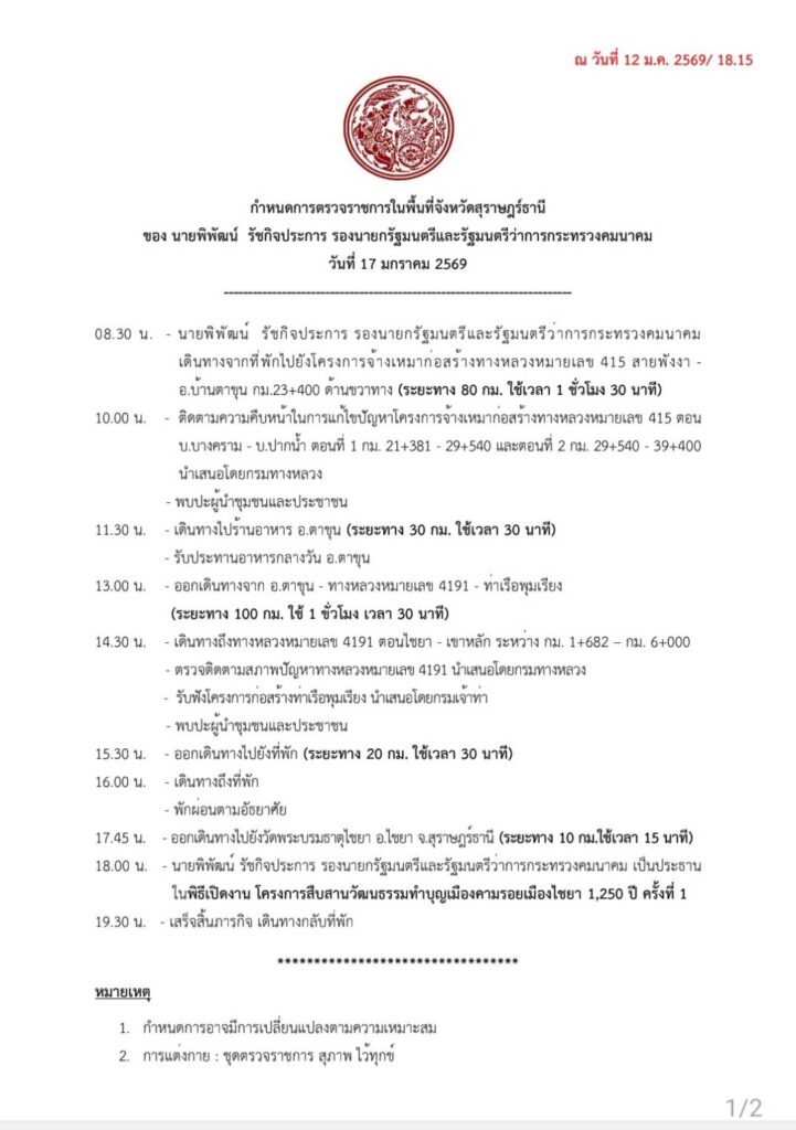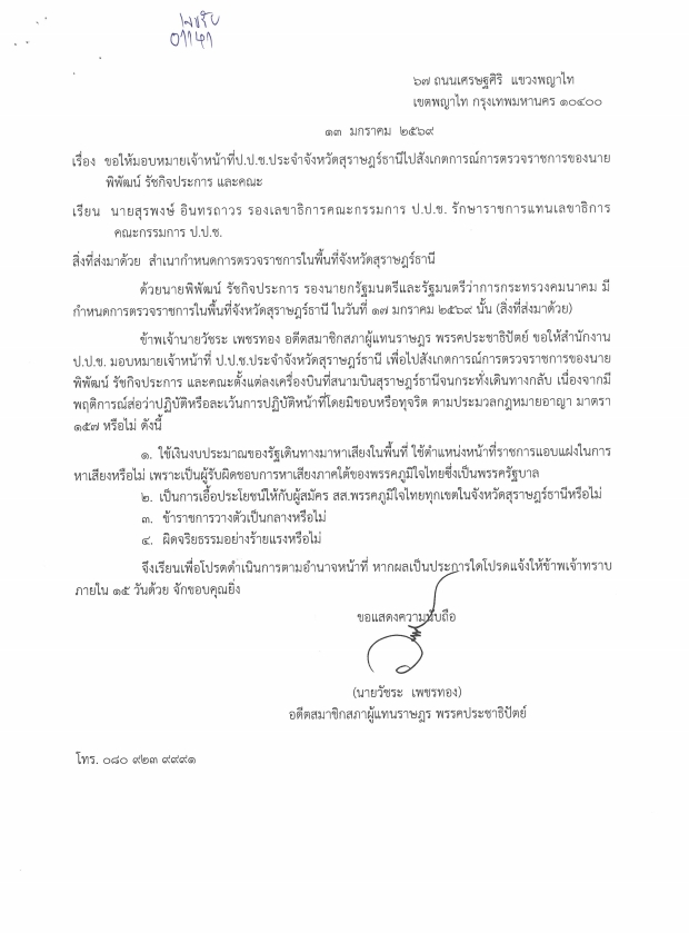 วันที่ 13 มกราคม 2569 ที่ผ่านมา นายวัชระ เพชรทอง แสดงให้เห็นถึงเขี้ยวเล็บทางการเมืองที่ไม่เคยทื่อ โดยบุกยื่นหนังสือถึงสำนักงาน ป.ป.ช. เพื่อเปิดปฏิบัติการ “X-Ray” กำหนดการของนายพิพัฒน์ ที่จะลงพื้นที่สุราษฎร์ธานีในวันที่ 17 มกราคมนี้