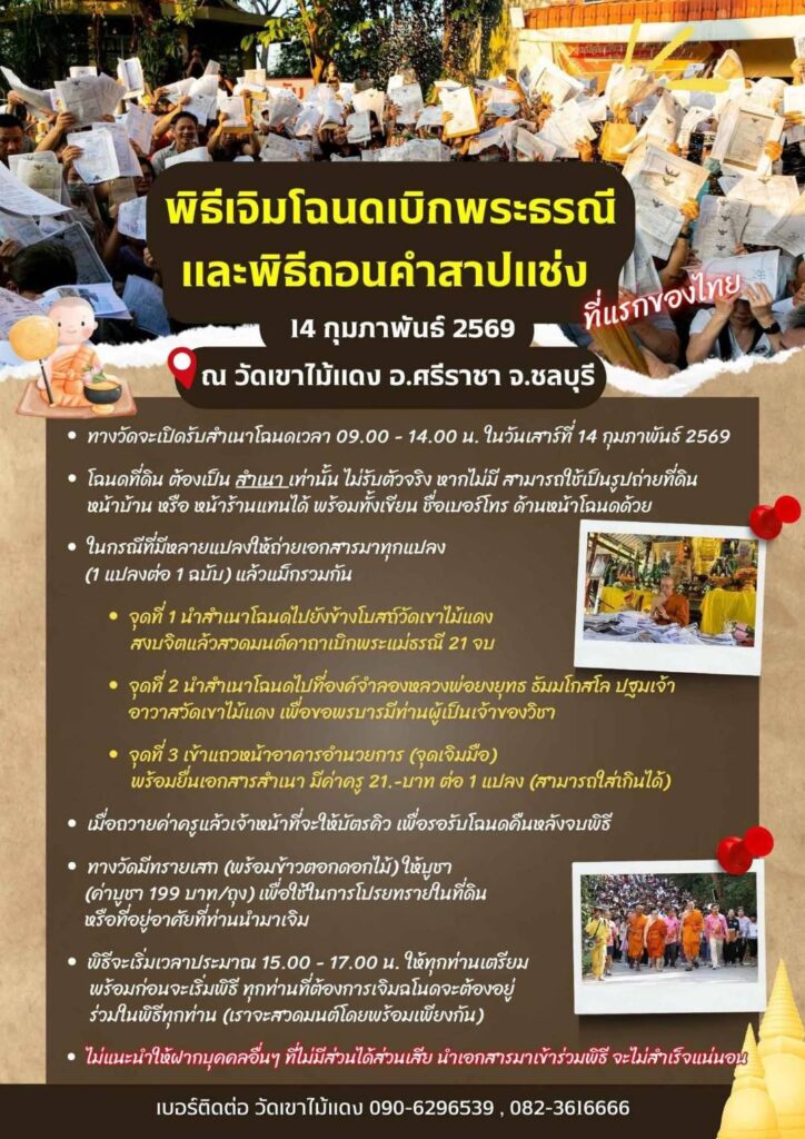 ด้วย ทางวัดเขาไม้แดง ตำบลบางพระ อำเภอศรีราชา จังหวัดชลบุรี จะมีการจัดพิธีเจิมโฉนดที่ดิน เบิกพระแม่ธรณี (ขายที่ ล้างอาถรรพ์ที่ดิน) ให้อยู่ร่มเย็นเป็นสุข โดยหลวงพ่อสง่า เทพเจ้ามีกินไม่รู้สิ้น ในวันเสาร์ที่ 14 กุมภาพันธ์ 2569 ที่จะถึงนี้ สำหรับ ประชาชนที่สนใจ ต้องการจะมาร่วมทำพิธีเจิมโฉนดที่ดิน ให้เตรียมใบโฉนดที่ดินแบบถ่ายเอกสาร มาให้เรียบร้อย (ทางวัดไม่มีที่ถ่ายเอกสาร) พร้อมค่าบูชาครู แปลงละ 21 บาท หรือตามกำลังศรัทธา หากไม่มีปัจจัยก็สามารถร่วมพิธีได้ วันเดียวเท่านั้น (วันที่ 14 กุมภาพันธ์ 2569) เริ่มรับลงทะเบียนโฉนดตั้งแต่เวลา 09.00 น.ไปจนถึงเวลา 14.00 น. เท่านั้น