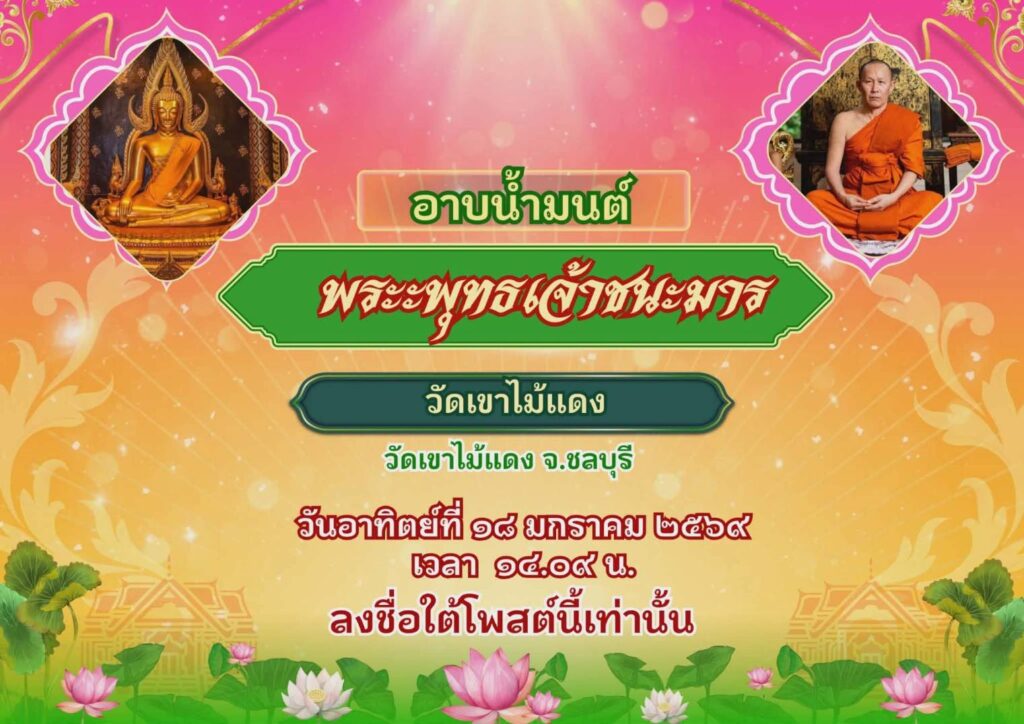 หลวงพ่อสง่า วัดเขาไม้แดง ตำบลบางพระ อำเภอศรีราชา จังหวัดชลบุรี เตรียมจัดพิธีอาบน้ำมนต์น้ำมนต์ “พระพุทธเจ้าชนะมาร มหากระดอนสะท้อนกลับ” เชื่อกันว่ามี พุทธคุณช่วยขจัดเคราะห์กรรม ปัดเป่าสิ่งไม่ดี ทำให้ศัตรูกลายเป็นมิตร ล้างคุณไสย และเสริมความเป็นสิริมงคลแก่ชีวิต โดยเฉพาะผู้ที่ถูกกลั่นแกล้ง ถูกใส่ร้าย หรือประสบอุปสรรคในหน้าที่การงาน โดยทางวัดเขาไม้แดงจัดพิธีอาบน้ำมนต์ตามฤกษ์ ในวันอาทิตย์ที่18 มกราคม2569นี้เวลา14.09น. โดยสามาลงชื่อในเพจเฟสบุ๊ก”ศรัทธาหลวงพ่อสง่าวัดเขาไม้แดง”เท่านั้นหรือสามารถเดินทางมาที่วัดเขาไม้แดงในวันทำพิธีอาบน้ำมนต์ได้เลย
