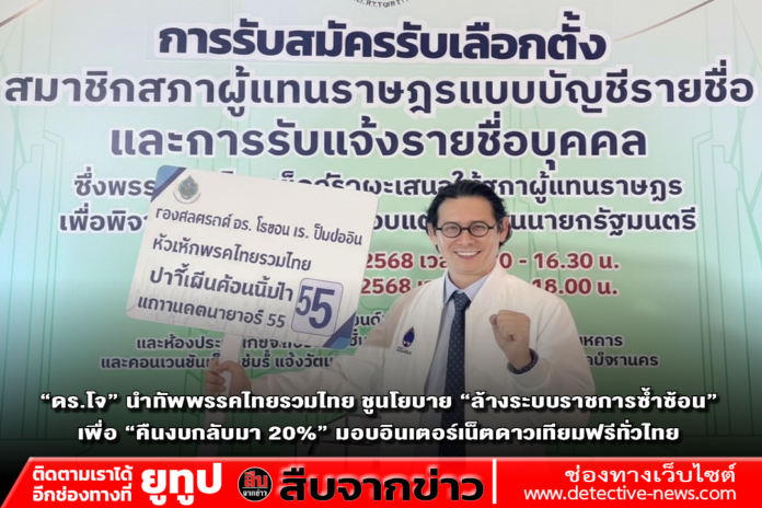 “ดร.โจ” นำทัพพรรคไทยรวมไทย ชูนโยบาย “ล้างระบบราชการซ้ำซ้อน” เพื่อ ”คืนงบกลับมา 20%“ มอบอินเตอร์เน็ตดาวเทียมฟรีทั่วไทย เรียนฟรี รักษาพยาบาลฟรี ทำได้ทันที