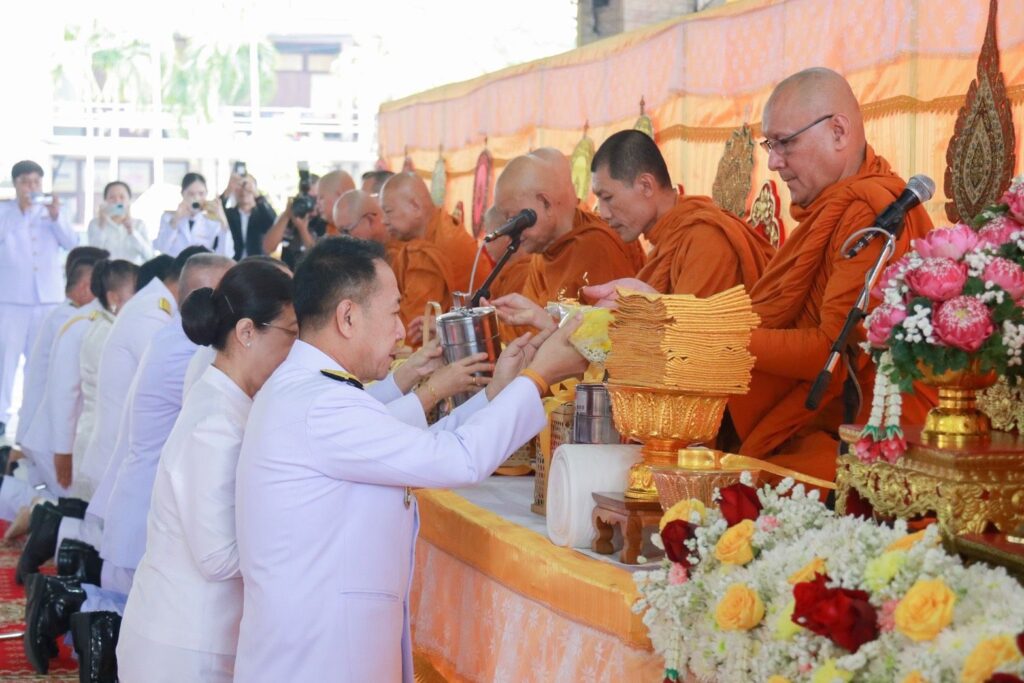 ในพิธีทางศาสนามีพระสงฆ์ทรงสมณศักดิ์จำนวน 10 รูป เจริญพระพุทธมนต์ ประธานในพิธีและหัวหน้าส่วนราชการถวายเครื่องไทยธรรม ทอดผ้าไตร และกรวดน้ำอุทิศส่วนกุศล เพื่อถวายเป็นพระราชกุศลแด่สมเด็จพระนเรศวรมหาราช