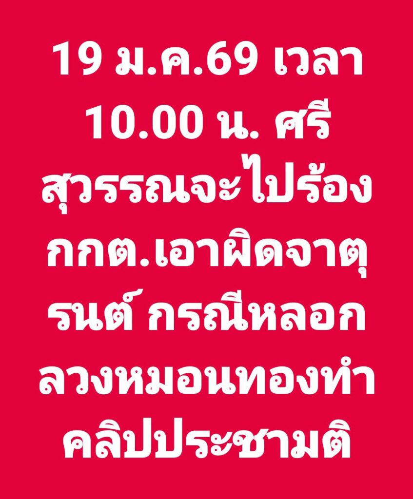 ผู้สื่อข่าวรายงานว่า วันนี้ (19 มกราคม 2569) เวลา 10.00 น. นายศรีสุวรรณ จรรยา ผู้นำองค์กรรักชาติ รักแผ่นดิน เตรียมเดินทางเข้ายื่นหนังสือร้องเรียนต่อคณะกรรมการการเลือกตั้ง (กกต.) เพื่อขอให้ตรวจสอบกรณีการนำนักฟุตบอลเยาวชนทีมโรงเรียนหมอนทองวิทยา มาจัดทำคลิปวิดีโอรณรงค์ประชามติรัฐธรรมนูญ โดยระบุว่าอาจเป็นการหลอกลวงและใช้เด็กเป็นเครื่องมือทางการเมือง