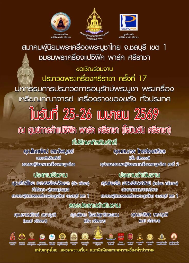 นายศักดิ์ไชย เบญจผ่องวัฒนา (ท้ง พัทยา) ที่ปรึกษา สมาคมผู้นิยมพระเครื่องพระบูชาไทย จังหวัดชลบุรี เขต1 ในฐานะประธานจัดงาน กล่าวว่า ขอเชิญชวนผู้ที่นิยมพระเครื่องพระบูชาไทย นักนิยมสะสมพระเครื่องทั่วประเทศ ร่วมงานการจัดงานประกวดพระเครื่องศรีราชา ครั้งที่ 17 ซึ่งจะจัดขึ้นที่ ศูนย์การค้า แปซิฟิค พาร์ค ศรีราชา 2วันเต็ม ในวันที่ 25-26 เมยายน 2569 นี้