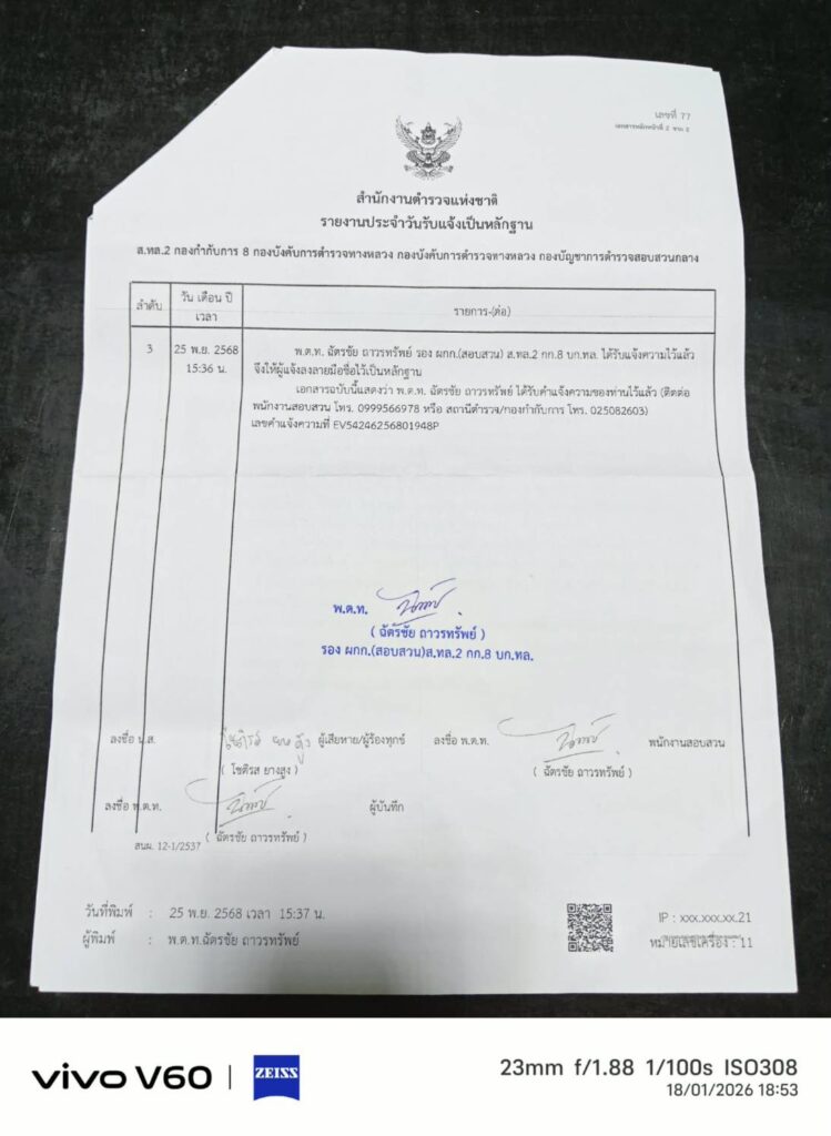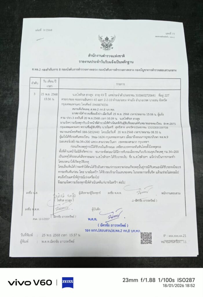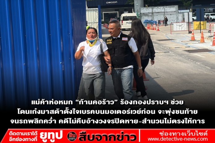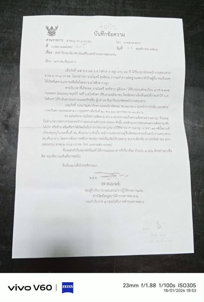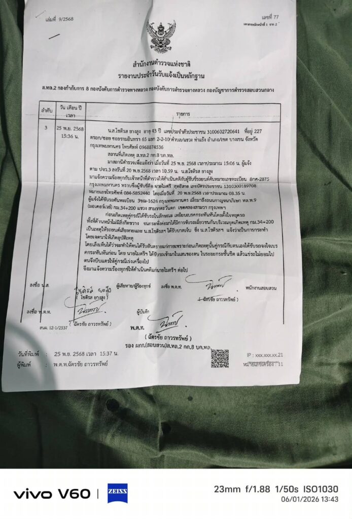 เวลา 10.30 น. วันที่ 19 ม.ค. 69 ที่ด้านหน้าโลตัส ลาดพร้าว จ่าคิงส์ แตงทิม สะพานใหม่ พา น.ส.โชติรส (ผู้เสียหาย) อายุ 43 ปี แม่ค้าห่อหมกปลาช่อน ร้านขายอยู่ย่านรามอินทรา กม.8 ร้องสื่อฯ ก่อนเข้าพบ พงส.บก.ป. กรณีประสบอุบัติเหตุรถเฉี่ยวชน