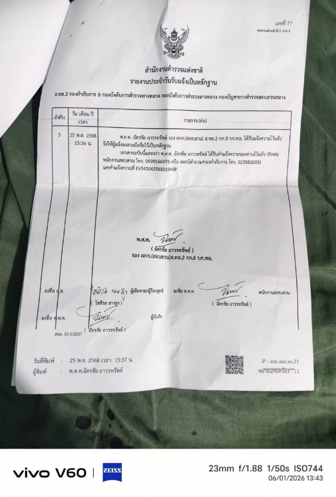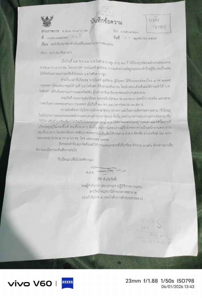เดิมทีสถานีตำรวจทางหลวง 2 (ส.ทล.2 กก.8 บก.ทล.) เป็นผู้รับเรื่อง แต่เมื่อตนประสงค์ที่จะดำเนินคดี