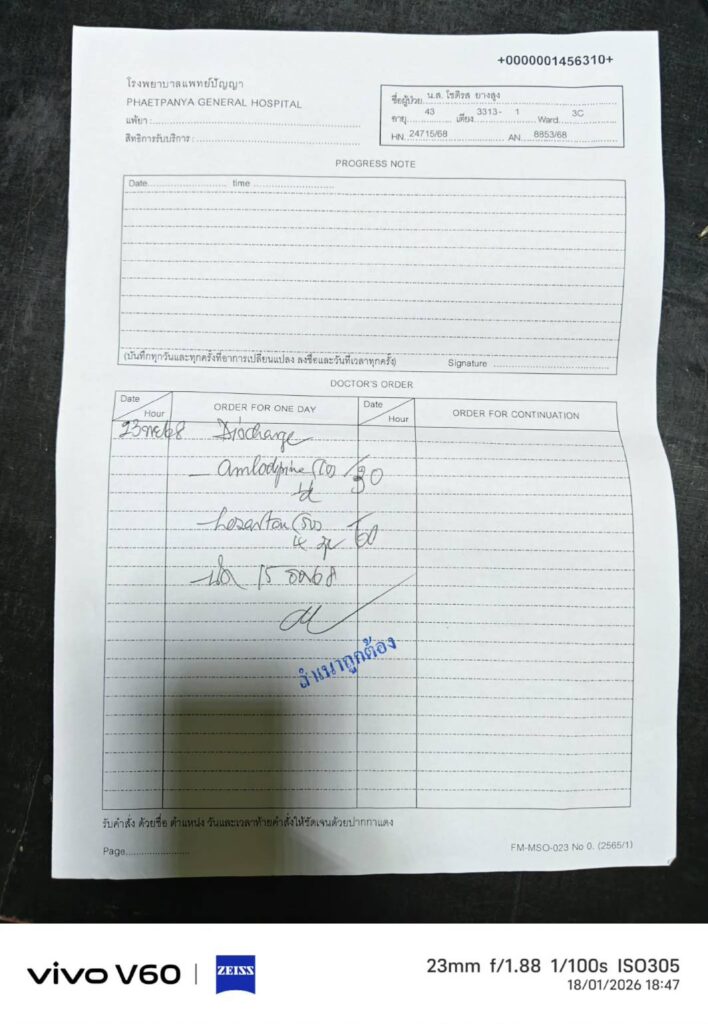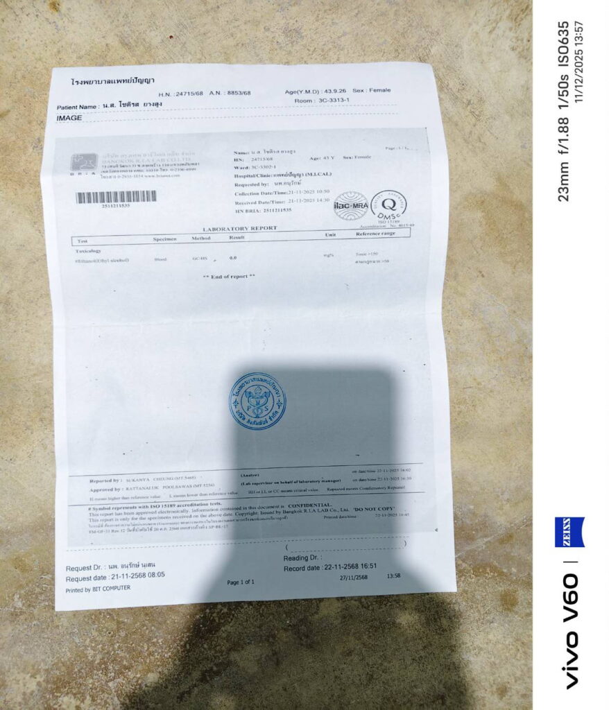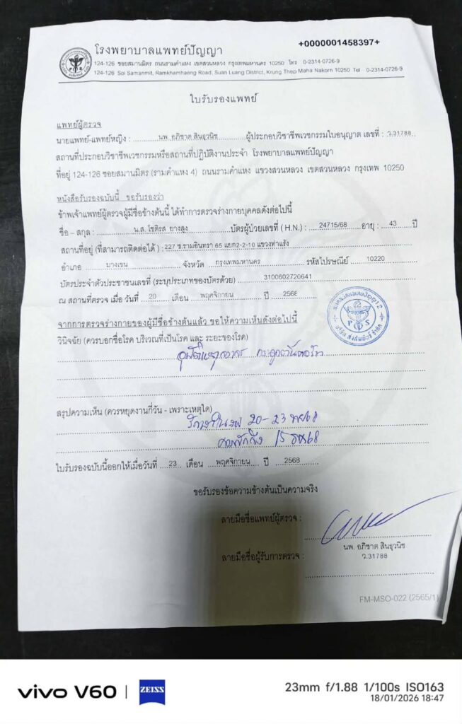 จากอุบัติเหตุครั้งนี้รถพลิกคว่ำหลายตลบ ส่งผลให้ตนได้รับบาดเจ็บสาหัส กู้ภัยนำตัวส่ง รพ.แพทย์ปัญญา เอ็กซเรย์พบว่ากระดูกต้นคอร้าวต้องใส่เผือกคอดามไว้ห้ามขยับเขยื่อนนานกว่า 2 เดือนเพื่อรอดูอาการต่อไป ใช้สิทธิ 30 บาทรักษาตัว ส่วนประกันภัยชั้นสอง รถปิคอีพของตนลงไว้ว่าตนเป็นฝ่ายถูก