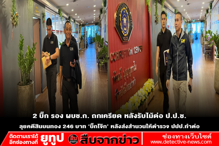 ประเด็นหลักการประชุม ที่ประชุมซึ่งนำโดย พล.ต.ต.สุวัฒน์ แสงนุ่ม รอง ผบช.ก. พล.ต.ต.จรูญเกียรติ ปานแก้ว รอง ผบช.ก. คณะพนักงานสอบสวน บก.ป., บก.ปปป. ได้ร่วมกันหารือเพื่อเตรียมความพร้อมรองรับมติจากคณะกรรมการป้องกันและปราบปรามการทุจริตแห่งชาติ (ป.ป.ช.) ในกรณีที่ส่งมอบสำนวนคดี “สินบนทองคำน้ำหนัก 246 บาท” กลับมาให้พนักงานสอบสวน บก.ปปป. เป็นผู้ดำเนินการตามกฎหมาย