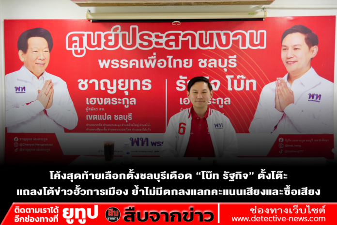 ล่าสุดวันนี้ (28 ม.ค. 2569) ที่ ศูนย์ประสานงานพรรคเพื่อไทยบางละมุง ถนนพัทยากลาง นายรัฐกิจ เฮงตระกูล (โบ๊ท) ผู้สมัคร สส. เขต 9 พรรคเพื่อไทย ได้จัดแถลงข่าวชี้แจงกรณีกระแสข่าวลือว่า มีการตกลงหรือฮั้วทางการเมืองกับพรรคการเมืองอื่น เพื่อให้นายรัฐกิจยอมแพ้ในการเลือกตั้ง ครั้งนี้ โดยยืนยันอย่างชัดเจนว่า ไม่เป็นความจริง และไม่มีการฮั้วกับพรรคใดทั้งสิ้น