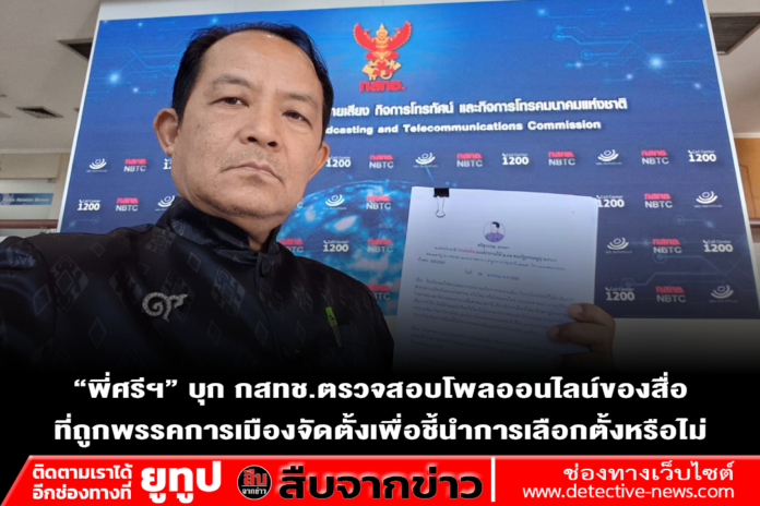 เวลา 11.00 น. วันที่ 29 ม.ค.69 ที่สำนักงาน กสทช. ถ.พหลโยธิน ซอย 8 นายศรีสุวรรณ จรรยา ผู้นำองค์กรรักชาติ รักแผ่นดิน ได้เดินทางมายื่นคำร้องต่อคณะกรรมการการกิจการกระจายเสียง กิจการโทรทัศน์ และกิจการโทรคมนาคมแห่งชาติ (กสทช.) เพื่อขอให้ตรวจสอบและเอาผิดสื่อบางสำนักที่สำรวจความคิดเห็นของประชาชนหรือโพลออนไลน์ เกี่ยวกับความนิยมของผู้สมัครหรือพรรคการเมืองในช่วงหาเสียงเลือกตั้งสมาชิกสภาผู้แทนราษฎร เป็นการฝ่าฝืนหรือไม่เป็นไปตามประกาศของ กสทช.หรือไม่