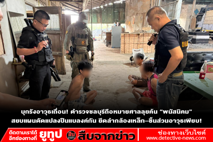 ปฏิบัติการกวาดล้างอาวุธปืนเถื่อนเมืองชล! ชุดสืบสวนสนธิกำลังถือหมายศาลบุกจู่โจมบ้านพักกลางตำบลสระสี่เหลี่ยม หลังสืบทราบพฤติการณ์ลักลอบดัดแปลงอาวุธ ตะลึงพบแท่งโลหะเตรียมขึ้นรูปเป็นลำกล้องปืนและชิ้นส่วนแบลงค์กัน (Blank Gun) ครบชุด เร่งส่งพนักงานสอบสวนขยายผลเส้นทางอาวุธ ลั่นกวาดล้างสิ้นซากเพื่อความปลอดภัยของพี่น้องประชาชนค่ะคะ
