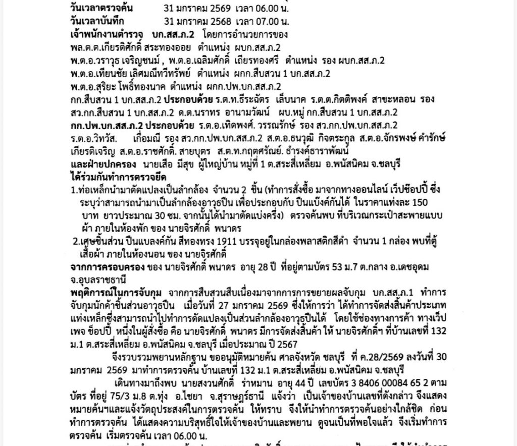 เมื่อวันที่ 30 มกราคม 2569 ภายใต้การอำนวยการเชิงรุกเพื่อกวาดล้างอาชญากรรม เจ้าหน้าที่ตำรวจชุดปฏิบัติการที่ 4 กองกำกับการสืบสวน 1 ได้รับอนุมัติหมายค้นจากศาลจังหวัดชลบุรี ที่ ค 28/2569 เข้าปิดล้อมตรวจค้นบ้านเลขที่ 132 หมู่ที่ 1 ตำบลสระสี่เหลี่ยม อำเภอพนัสนิคม จังหวัดชลบุรี หลังพบเบาะแสความเคลื่อนไหวที่ผิดสังเกตเกี่ยวกับอาวุธปืนเถื่อนในพื้นที่ค่ะ