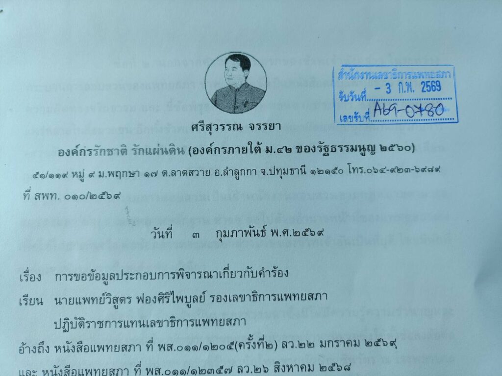 วันที่ 3 ก.พ.69 เวลา 11.00 น.ที่อาคารมหิตลาธิเบศร กระทรวงสาธารณสุข นายศรีสุวรรณ จรรยา ผู้นำองค์กรรักชาติ รักแผ่นดิน ได้เดินทางมายื่นเอกสารข้อมูล(เพิ่ม) หลังจากที่แพทยสภามีหนังสือขอข้อมูลประกอบการพิจารณาการสอบสวนจริยธรรมกลุ่มแพทย์ทุกคนที่เกี่ยวข้องกับการรักษานายทักษิณ ชินวัตร ว่ามีเหตุเพียงพอที่จะมีมติลงโทษเฉกเช่น 3 หมอที่มีมติลงโทษไปเมื่อ 8 พ.ค.68 ก่อนหน้านี้หรือไม่