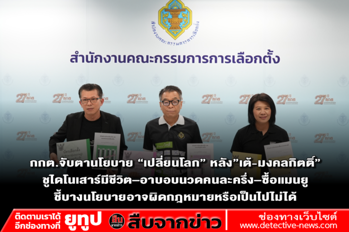 กกต.จับตานโยบาย “เปลี่ยนโลก” หลัง”เต้-มงคลกิตติ์” ชูไดโนเสาร์มีชีวิต–อาบอบนวดคนละครึ่ง–ซื้อแมนยู ชี้บางนโยบายอาจผิดกฎหมายหรือเป็นไปไม่ได้ ส่งหนังสือเตือนพรรคทางเลือกใหม่ ตรวจเข้มเข้าข่ายฝ่าฝืน พ.ร.ป.พรรคการเมือง